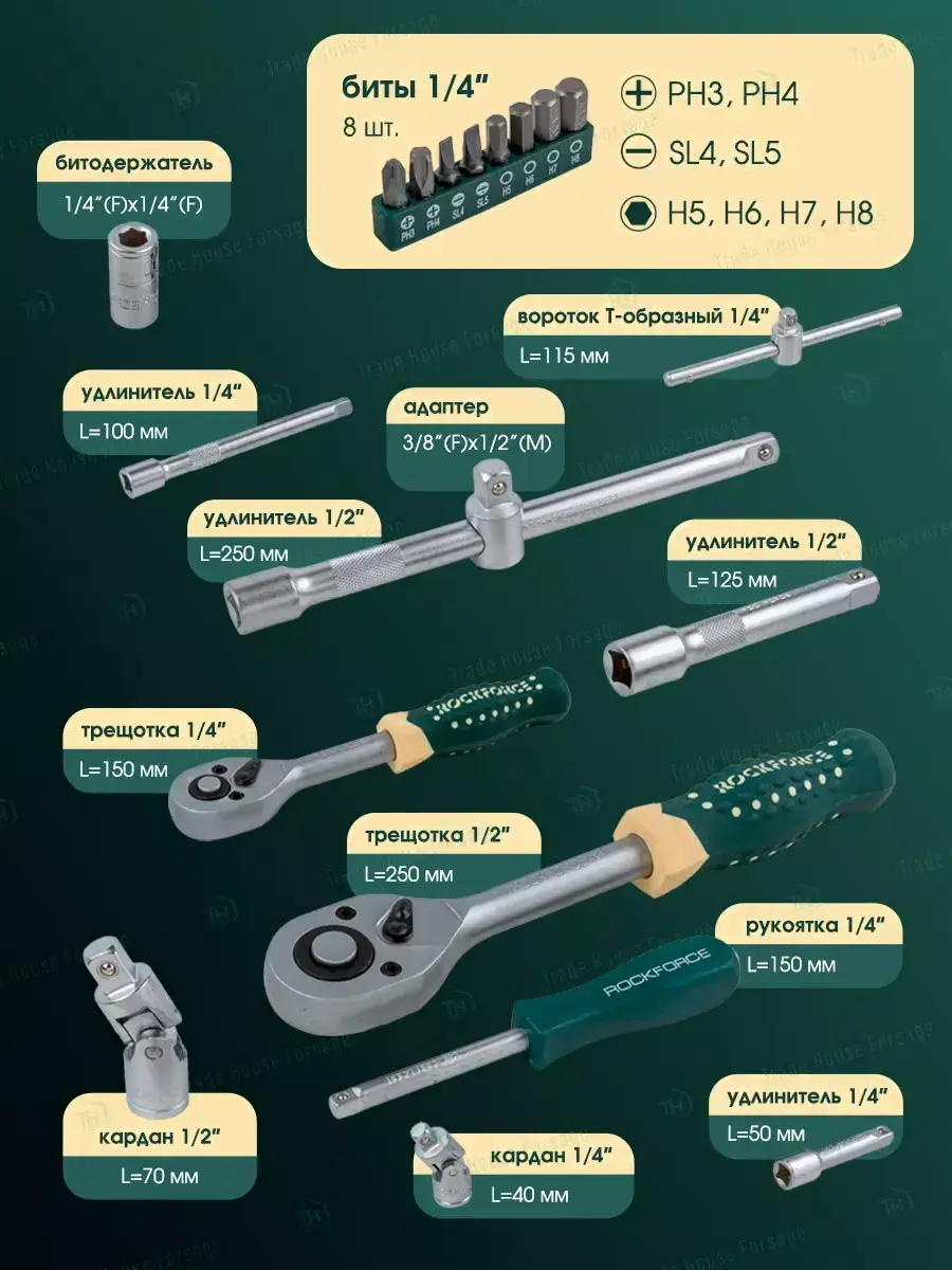 • Глубокие торцевые головки 1/2″ (14, 15, 17, 19, 22 мм), 1/4″ (6, 7, 8, 9, 10, 11, 12, 13 мм)