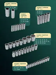 • Торцевые головки 1/2" (10-19, 20, 21, 22, 24, 27, 30, 32 мм), 1/4" (4, 4.5, 5, 5.5, 6, 7, 8, 9, 10, 11, 12, 13, 14 мм)