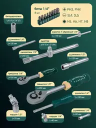 • Оснастка головки (45 шт.), насадки-биты (8 шт.), удлинители (4 шт.), кардан (2 шт.), держатель (1 шт.)