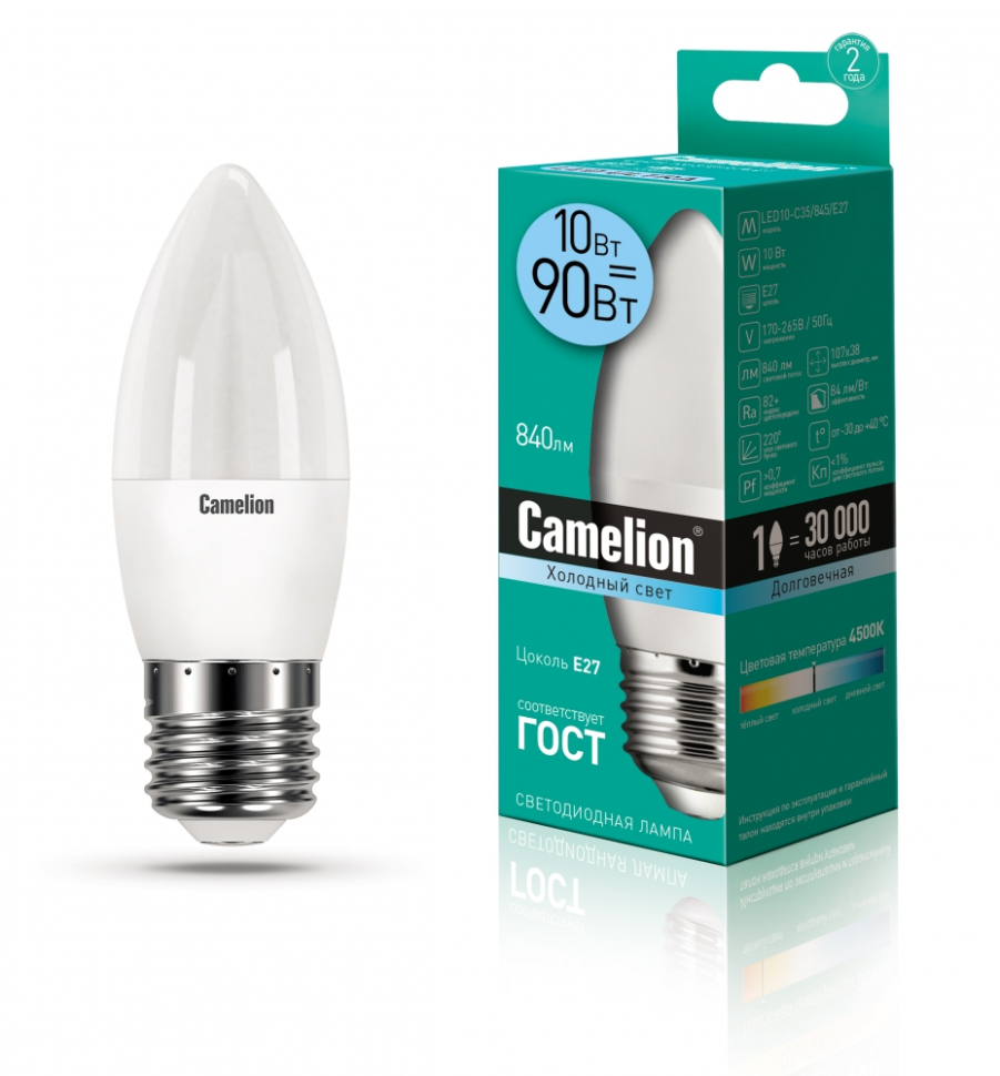 Нарушена упаковка! <189322> Светодиодная лампа E27 10W 4500К (белый) C35 Camelion LED10-C35/845/E27 (13562)