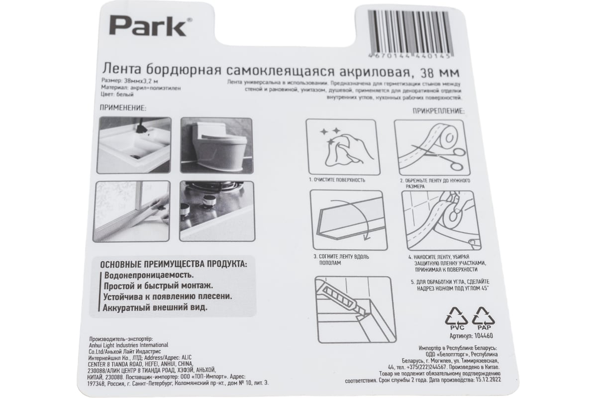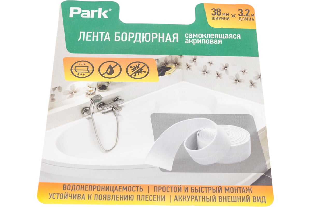 Бордюрная самоклеящаяся акриловая лента PARK 38 мм 104460 предназначена для герметизации стыков между стеной и раковиной, унитазом, душевой, применяется для декоративной отделки внутренних углов, кухонных рабочих поверхностей. Лента универсальна в использовании. Материал: акрил + полиэтилен.