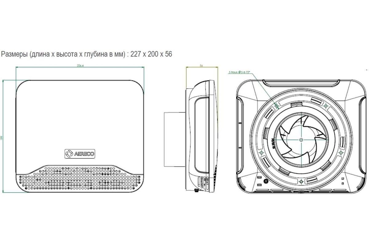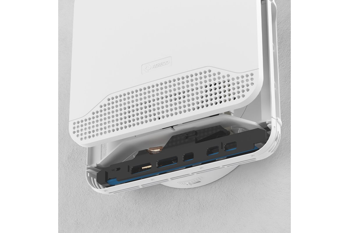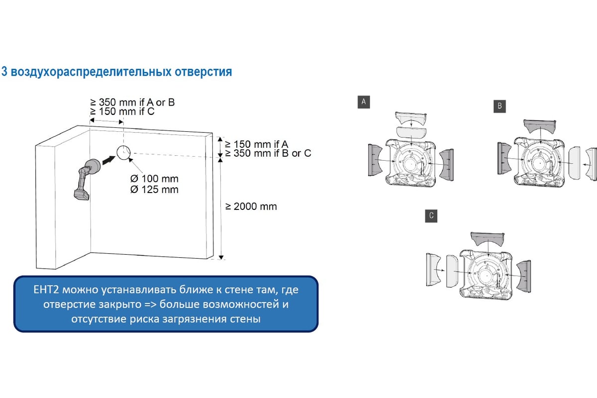 Три выхода для организации притока воздуха: два сбоку и одно сверху. Благодаря этому существует несколько вариантов настенного монтажа в зависимости от планировки помещения.