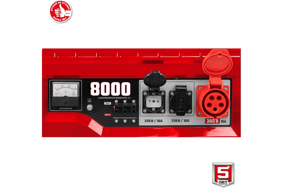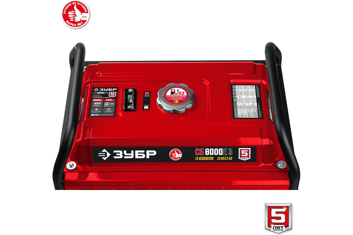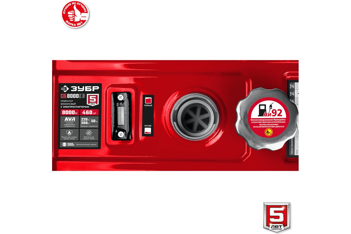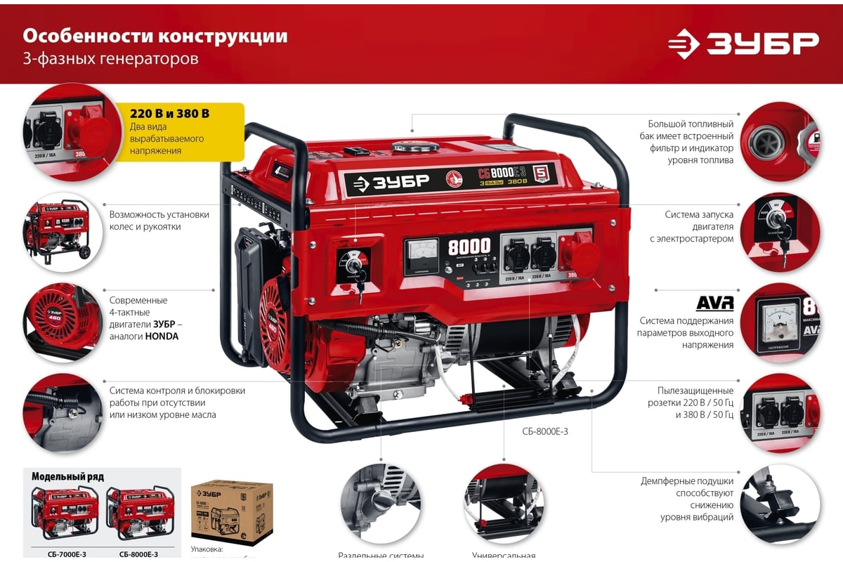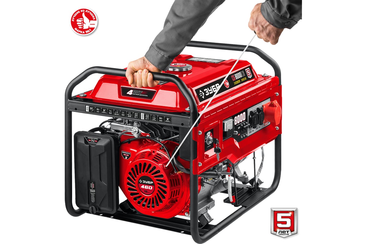 Бензиновый генератор с электростартером ЗУБР 8000 Вт СБ-8000Е-3 - мощная электростанция для подключения не только бытовых устройств, но и различного инструмента. Отсутствие необходимости приготовления смеси из бензина и масла существенно упрощает обслуживание генератора.