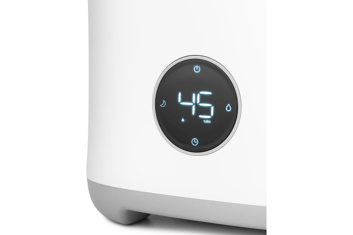 Прибор оборудован встроенным датчиком влажности и панелью управления с дисплеем. Можно установить интенсивность увлажнения, таймер автоотключения и перевести прибор в ночной режим работы. Дисплей показывает уровень влажности в комнате и выбранный режим.
