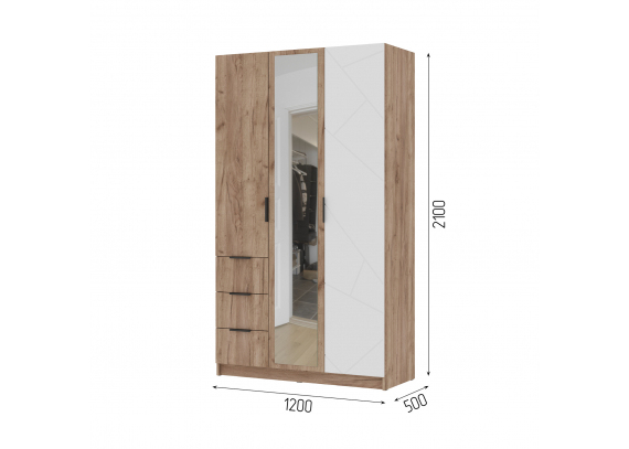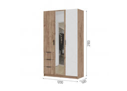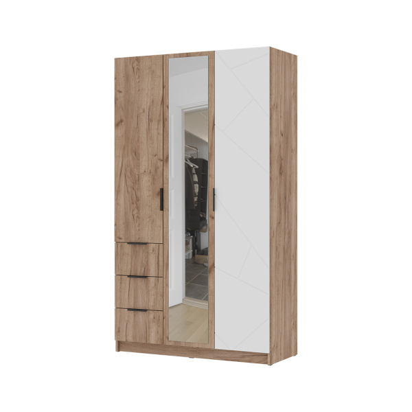 Трехстворчатый шкаф Орегон - это идеальное сочетание вместительности, стиля и функциональности. Модель включает полноценное отделение со штангой для вешалок, набор удобных полок, а также три выдвижных ящика, которые отлично подходят для хранения мелочей и текстиля. Зеркальная дверь визуально расширяет пространство, а геометричная фрезеровка на МДФ-фасаде и контраст белого или серого декора с древесным оттенком корпуса добавляет шкафу выразительности. Такой шкаф станет гармоничным решением как для спальни, так и для просторной прихожей.