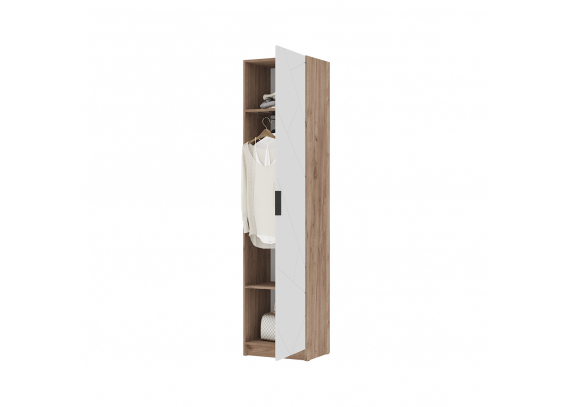 Шкаф с выкатной штангой Орегон - практичное решение для хранения одежды в компактном формате. Фасад из МДФ с геометричной фрезеровкой подчеркивает современный характер коллекции, а сочетание белого или серого декора с древесной текстурой корпуса придает мебели стильный и уютный вид. Внутри расположен выдвижной кронштейн для вешалок, а также полки для сумок, обуви и других вещей. Шкаф отлично подойдет как для прихожей, так и для спальни, гардеробной или любого другого помещения.