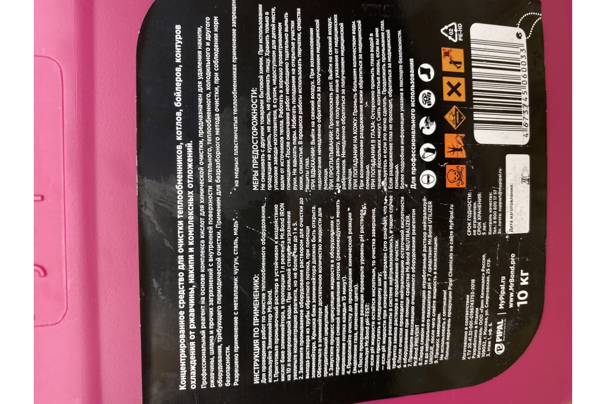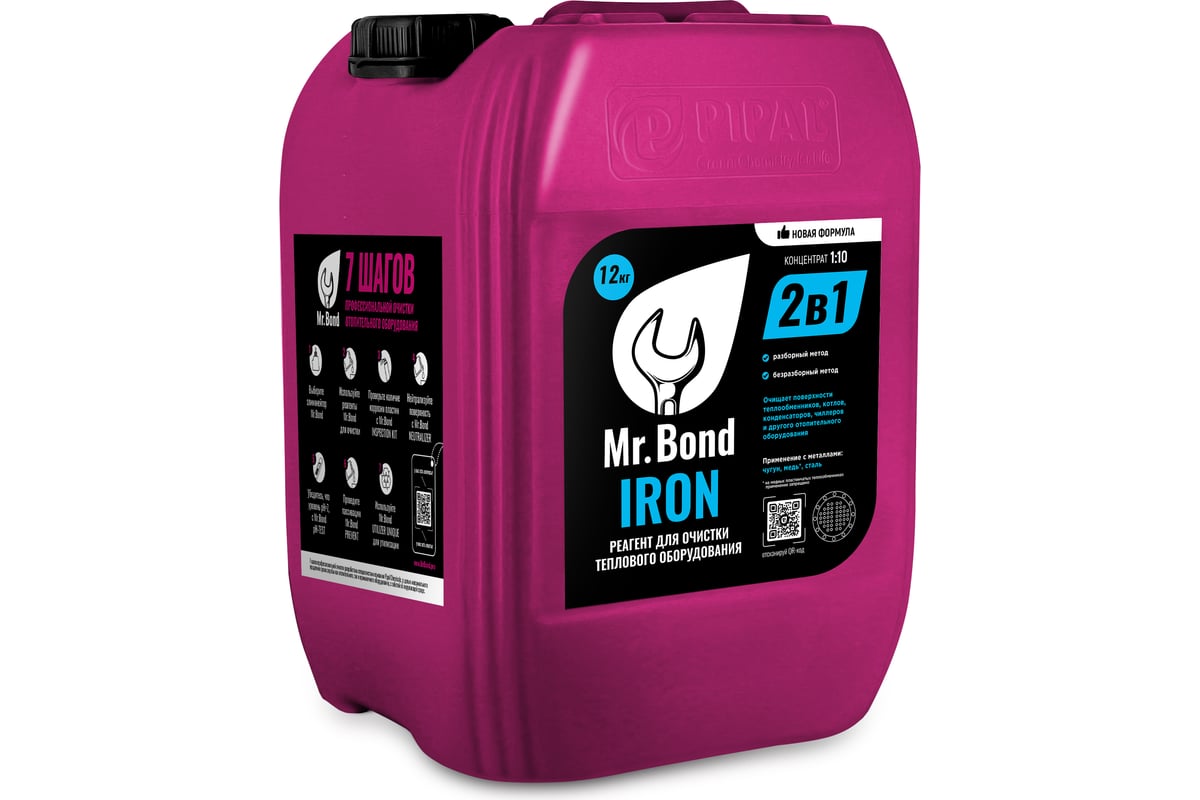 Реагент для промывки теплообменников Mr.Bond IRON MB2021010010 предназначен для очистки внутренней поверхности инженерных систем от ржавчины, накипи, шлама, известкового налета и прочих вредных отложений.