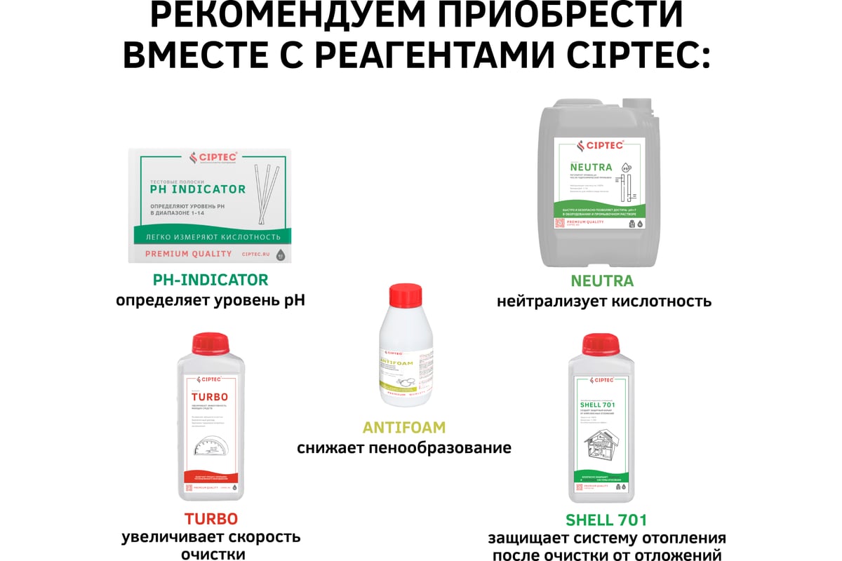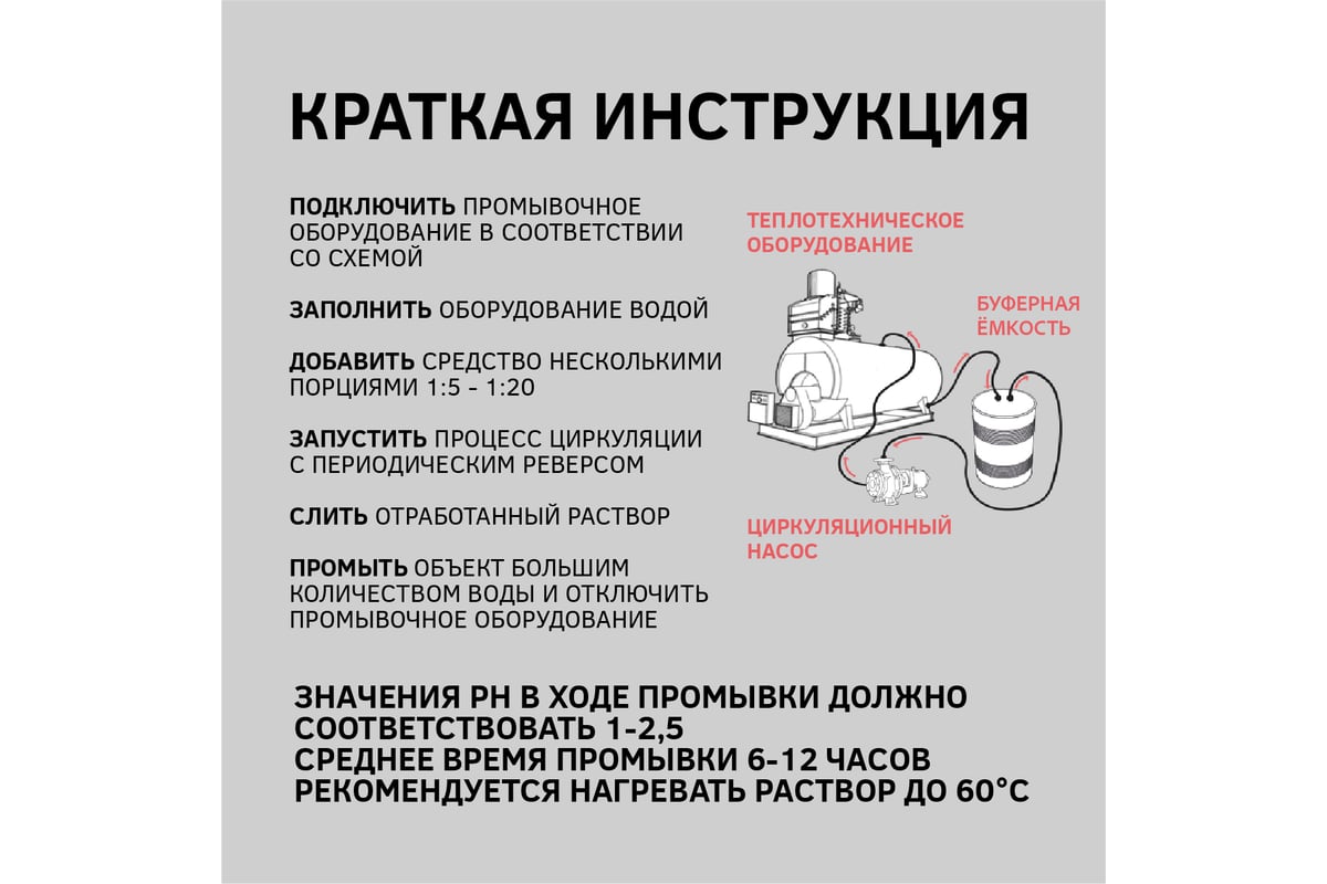 ВНИМАНИЕ! Реагент не содержит соляной кислоты и ионов хлора. Разрешается промывать оборудование из нержавеющих сталей! Отсутствует риск вызвать питтинговую коррозию.