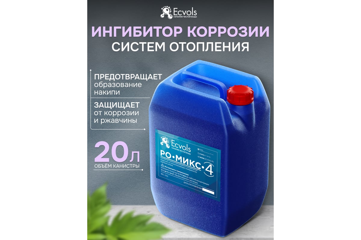 Ингибитор накипеобразования и коррозии систем отопления Ecvols РО-Микс-КО-4, 20 л, 22 кг 00.00011649 предотвращает образование накипи (удаление накипи, чистка от накипи) и защищает от коррозии (защита от ржавчины).