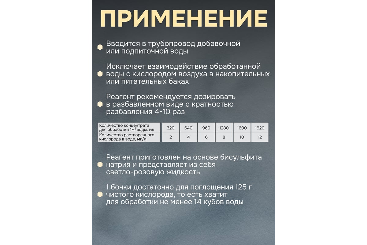 Является полным аналогом Амината КО-2 . 1 бочки достаточно для поглощения 125 г чистого кислорода, то есть хватит для обработки не менее 14 куб.м воды.