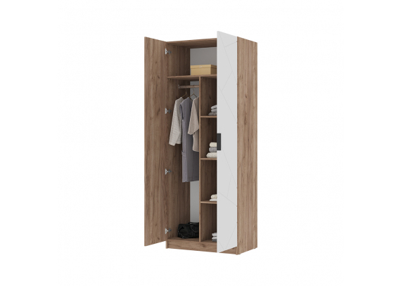 Двустворчатый шкаф Орегон - универсальное хранение для одежды и текстиля, объединяющие стиль и функциональность. МДФ-фасад с геометричной фрезеровкой выполнен в белом или сером декоре и эффектно контрастирует с корпусом под теплое дерево. Внутри предусмотрено отделение со штангой для вешалок и удобными полками, что делает шкаф идеальным выбором как для спальни, так и для прихожей или гардеробной.