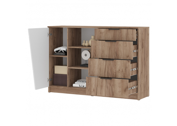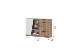 Комод Орегон - это гармоничное сочетание стиля и практичности для хранения одежды, аксессуаров и повседневных мелочей. Четыре вместительных ящика дополнены открытыми полками и закрытым отсеком за МДФ-фасадом с геометричной фрезеровкой, выполненном в белом или сером декоре. Теплая древесная текстура корпуса придает комоду уют и делает его универсальным элементом интерьера спальни, гостиной или прихожей.