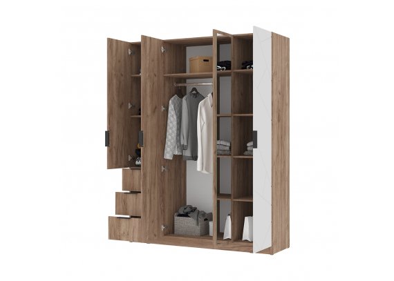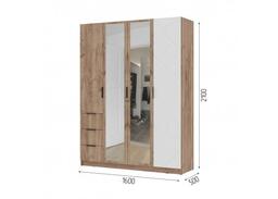 Четырехстворчатый шкаф Орегон - максимально функциональное решение для хранения, сочетающее продуманную внутреннюю организацию и современный внешний вид. Модель включает полноценное платяное отделение со штангой, множество полок, а также три выдвижных ящика, для аксессуаров и мелочей. Две зеркальные двери визуально увеличивают пространство, а контраст геометричного МДФ-фасада в белом или сером декоре с теплым древесным корпусом делает шкаф стильным центром интерьера спальни, гардеробной или просторной прихожей.