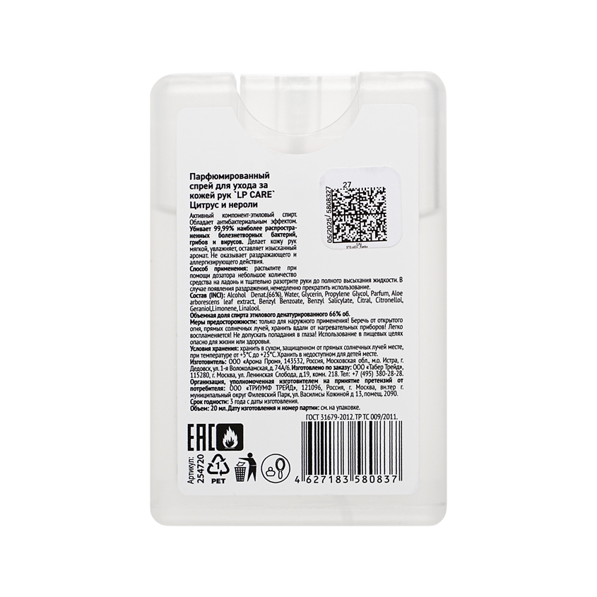 Парфюмированный спрей для ухода за кожей рук `LP CARE` Цитрус и нероли 20 мл