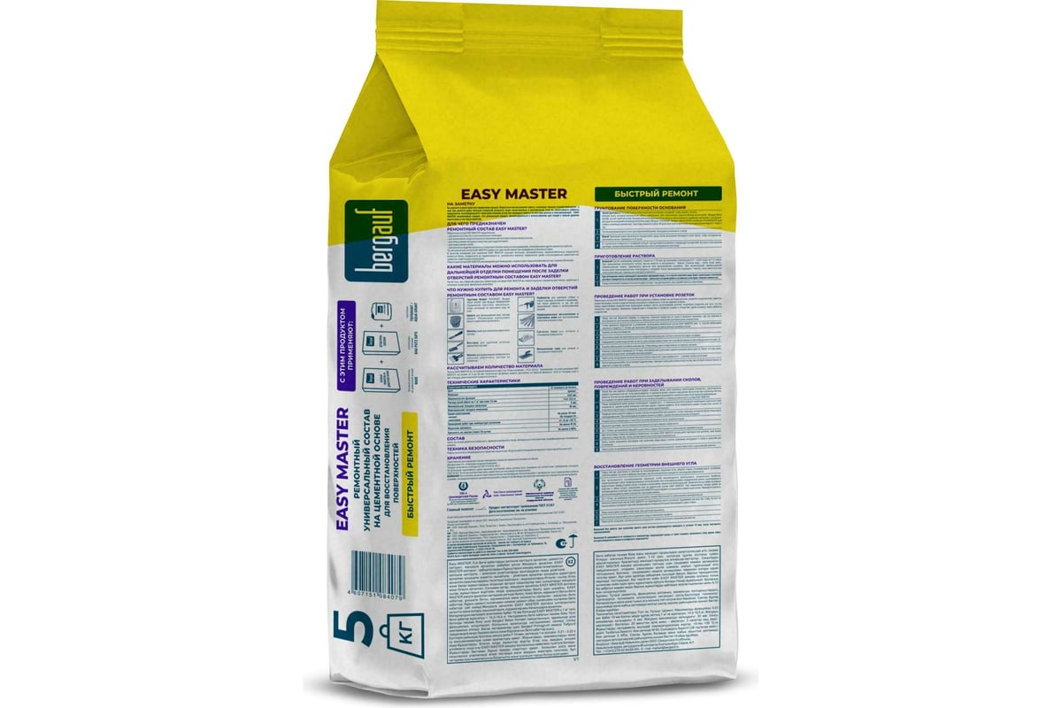 Универсальный ремонтный состав Bergauf Bergauf Easy Master на цементной основе для восстановления поверхностей, 5 кг 38026 - это уникальный продукт, рекомендованный к использованию для людей с любым уровнем подготовки, в том числе новичков.