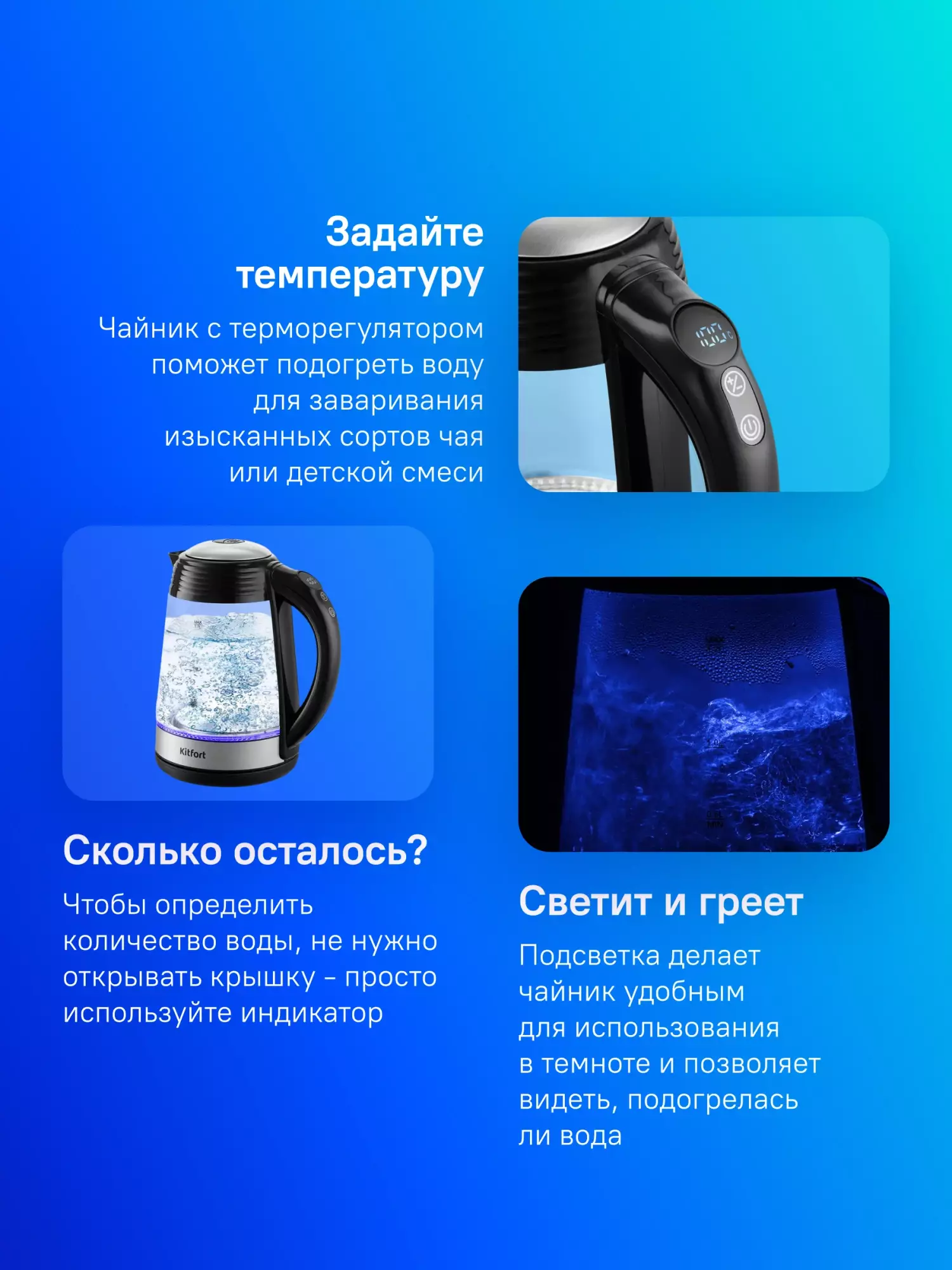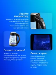 ОписаниеМощный и вместительный чайник Kitfort КТ-6126 отлично подойдёт для тёплых встреч с семьёй и друзьями. За один раз в чайнике можно вскипятить до 1,7 л воды. Этого хватит, чтобы приготовить горячие напитки на большую семью!