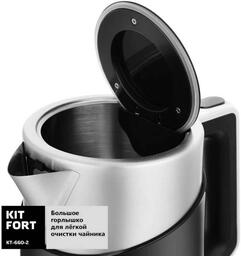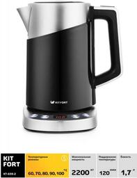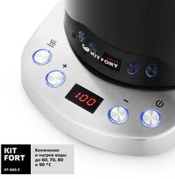 ОсобенностиЭлектрический чайник с электронным терморегулятором Kitfort КТ-660 может не только вскипятить воду, но и нагреть ее до температуры 60, 70, 80, 90 и 100°С, что очень удобно при заваривании различных сортов чая. Чайник также оснащен функцией поддержания температуры.