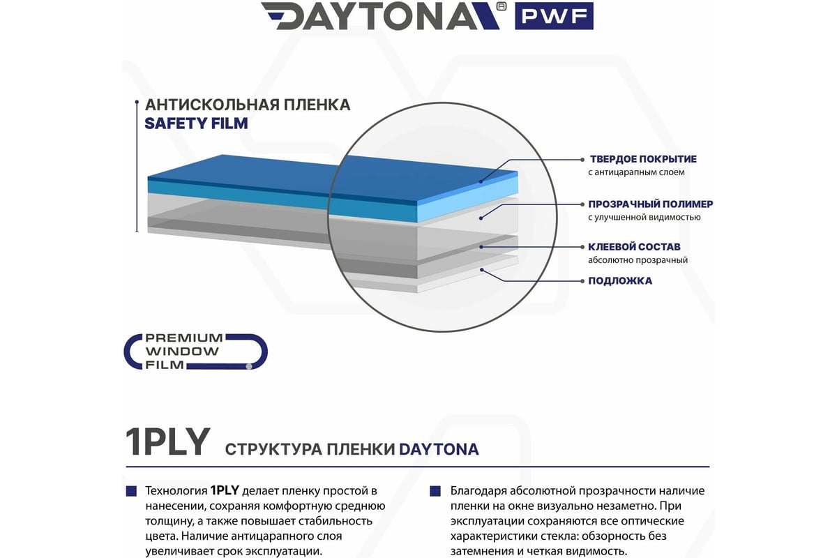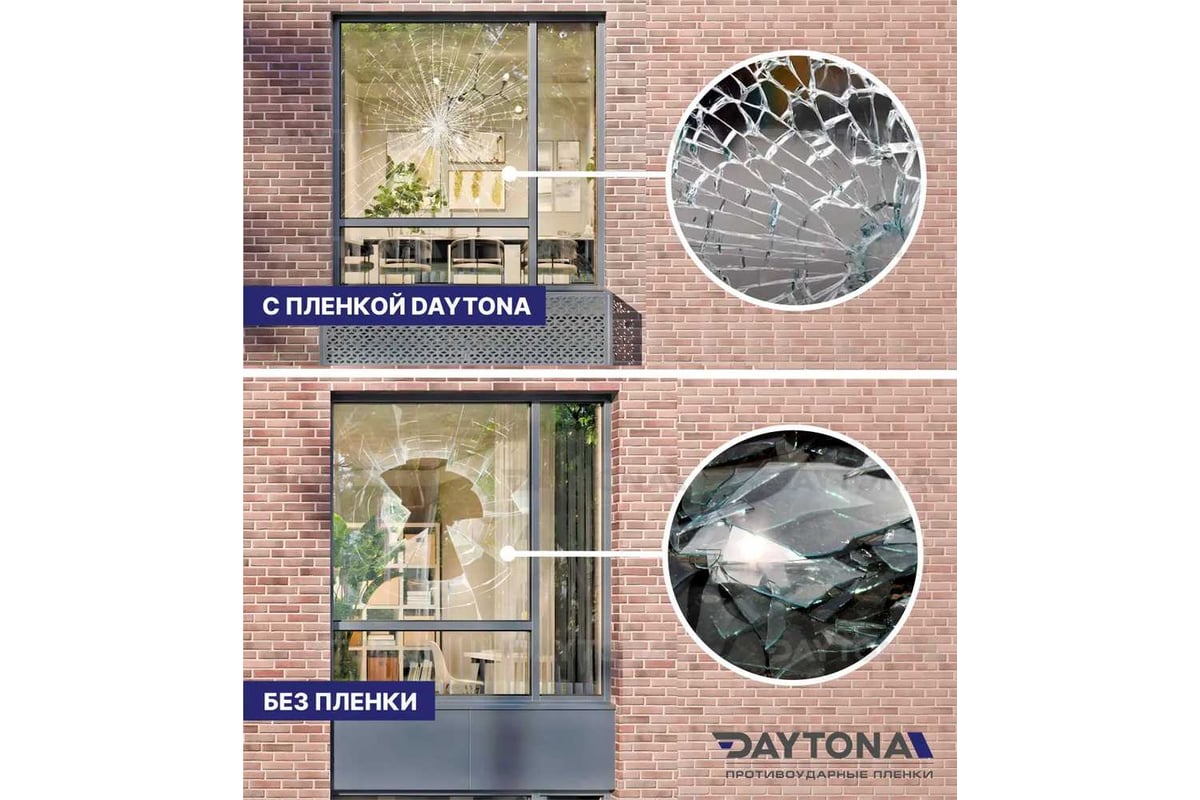 Защитная пленка DAYTONA предназначена для бронирования ровных стеклянных покрытий. Бронепленка придаст дополнительную прочность стеклу и предотвратит образование осколков. Бронирующая пленка подходит: на окна, на стол, на двери, на перегородки, на телефон и планшет (необходима плоттерная резка!), на зеркало, для систем хранения: кухонный шкафчик, сервант, витрину. Также данный материал может идти вторым слоем — т.е. поверх другой пленки, например, сверху черной тонировки.