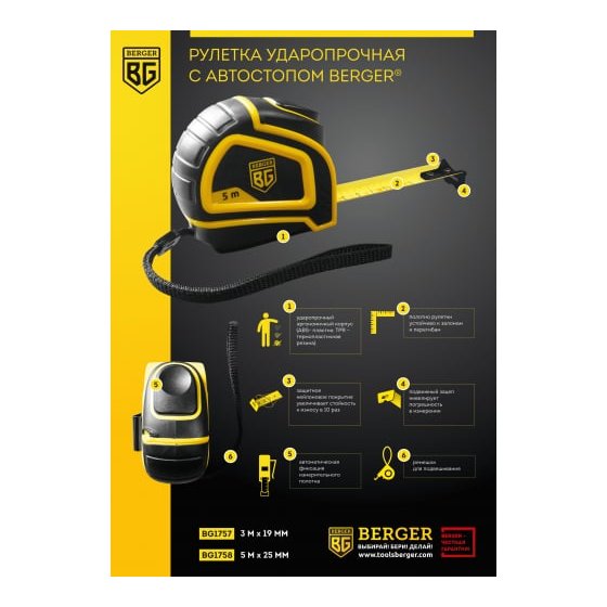 Рулетка BERGER BG1758 ударопрочная с автостопом 5м*25мм