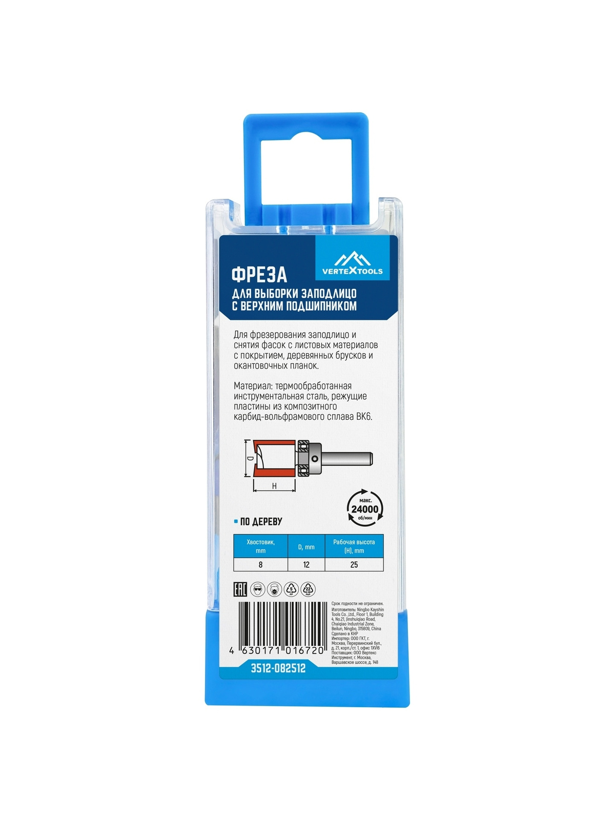 Фреза для выборки заподлицо с верхним подшипником 12x25x65,4мм VerteXtools