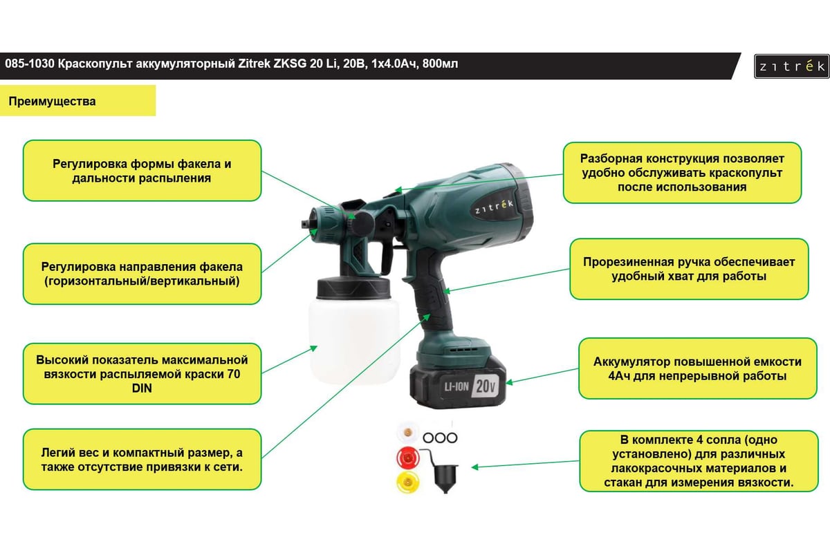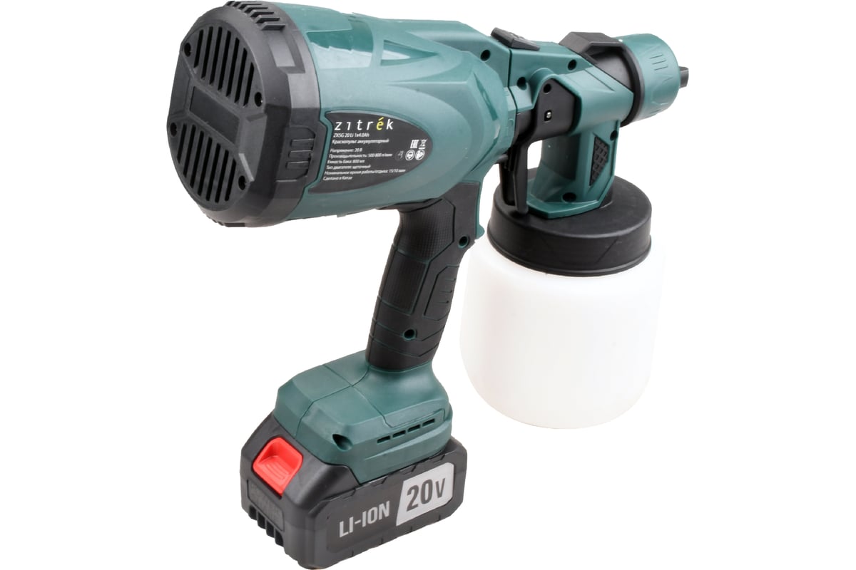 Краскопульт аккумуляторный Zitrek ZKSG 20 Li, 20В, 1x4.0Ач, 800мл 085-1030