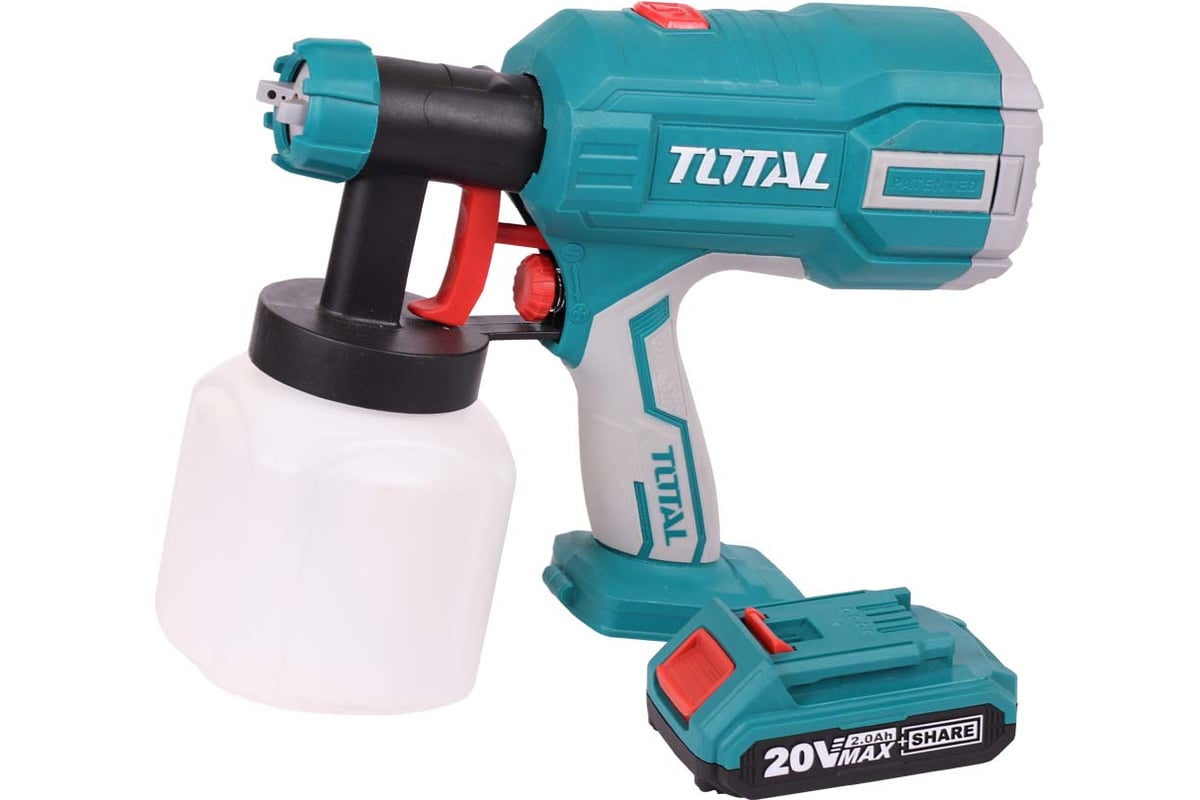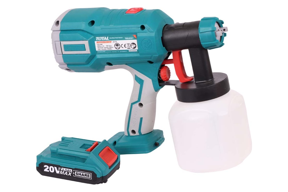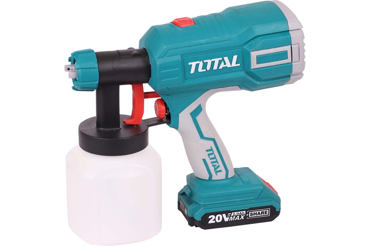 Аккумуляторный краскораспылитель TOTAL TSGLI2001 используется для равномерного распыления ЛКМ.