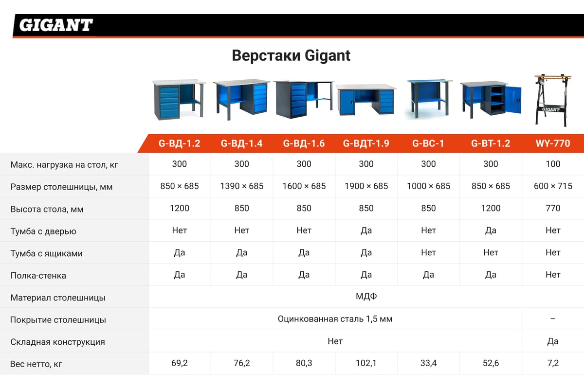 Верстак-стол 1000х685х850 Gigant, нагрузка 300кг, столешница 25мм МДФ, ВС G-ВС-1 (Россия)