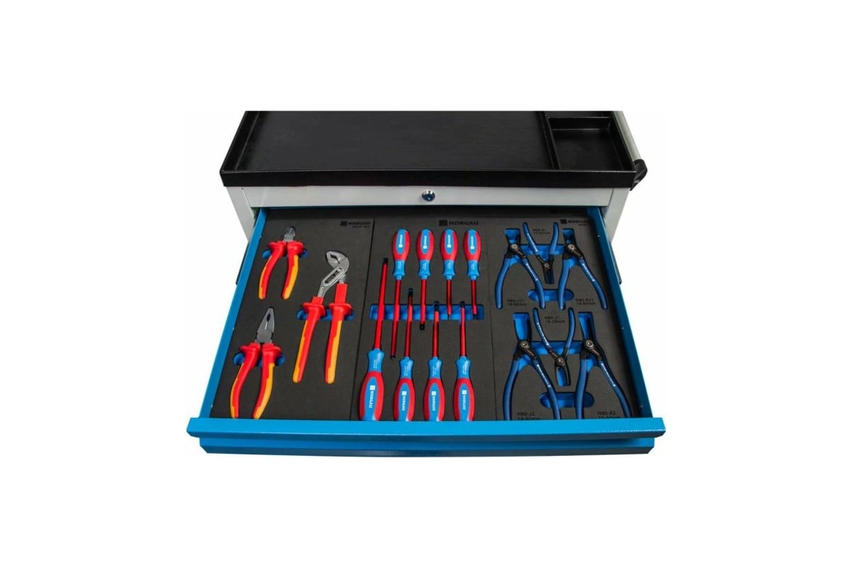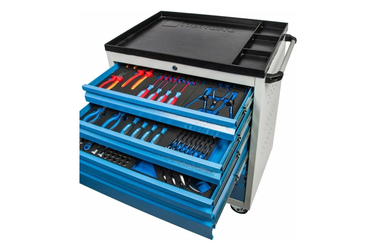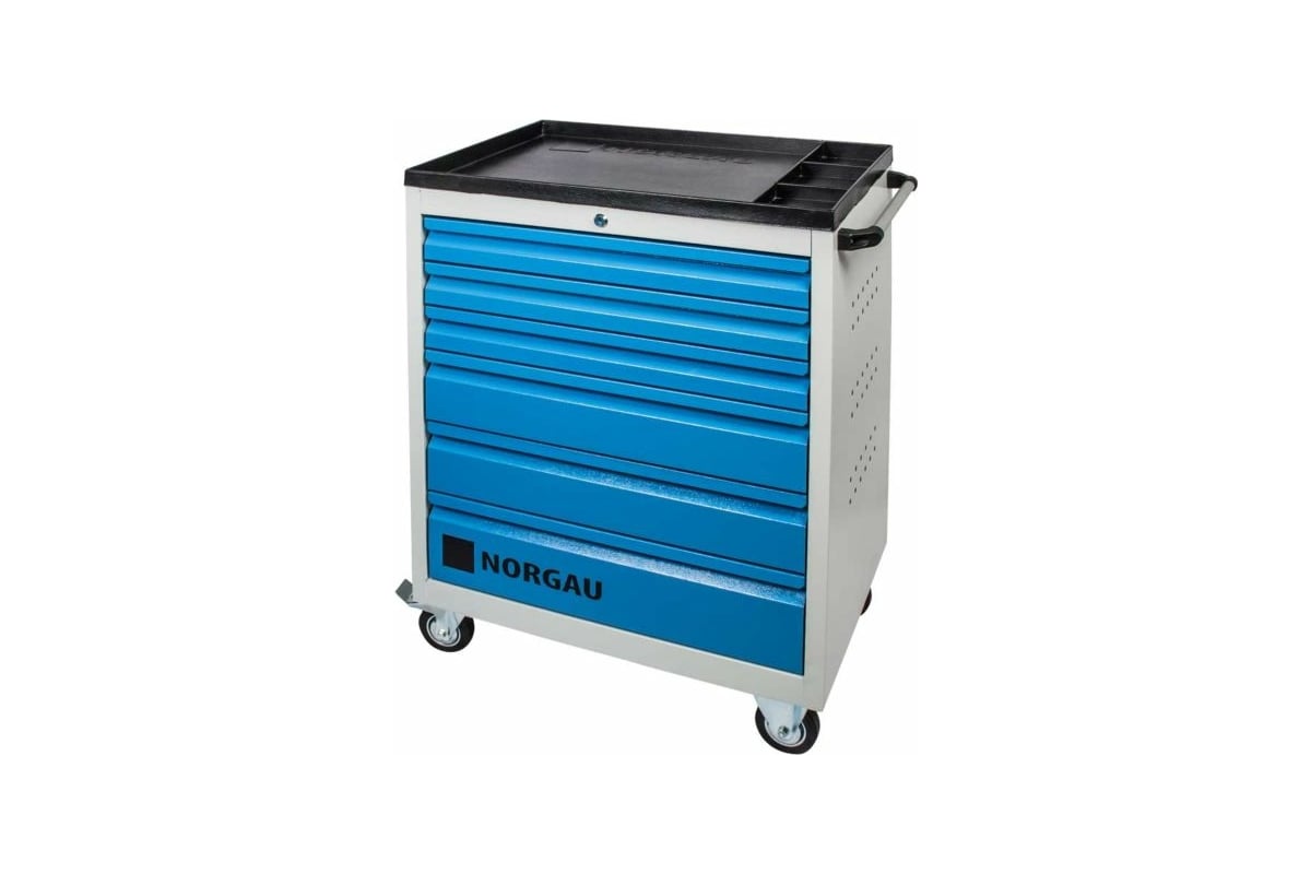 Инструментальная тележка NORGAU 6 ящиков, 915x695x490 RAL7035/5012 ТН173293 представляет собой систему хранения ручного инструмента. Состоит из 6 ящиков размером 3х75 мм, 2х125 мм, 1х160 мм и грузоподъемностью 45 кг.