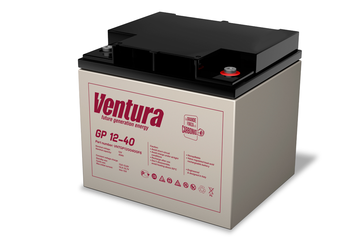 Батарея Ventura серия GP, GP12-40, напряжение 12B, емкость 40Ач (разряд 20 часов), макс. ток заряда 12А, свинцово-кислотная типа AGM, клеммы F6, ДШВ 197х165х170мм, вес 12кг/ Ventura battery GP series, GP12-40, voltage 12V, capacity 40Ah (discharge 20 hours), max. charging current 12A, lead-acid type AGM, terminals F6, LxWxH 197x165x170mm, weight 12kg