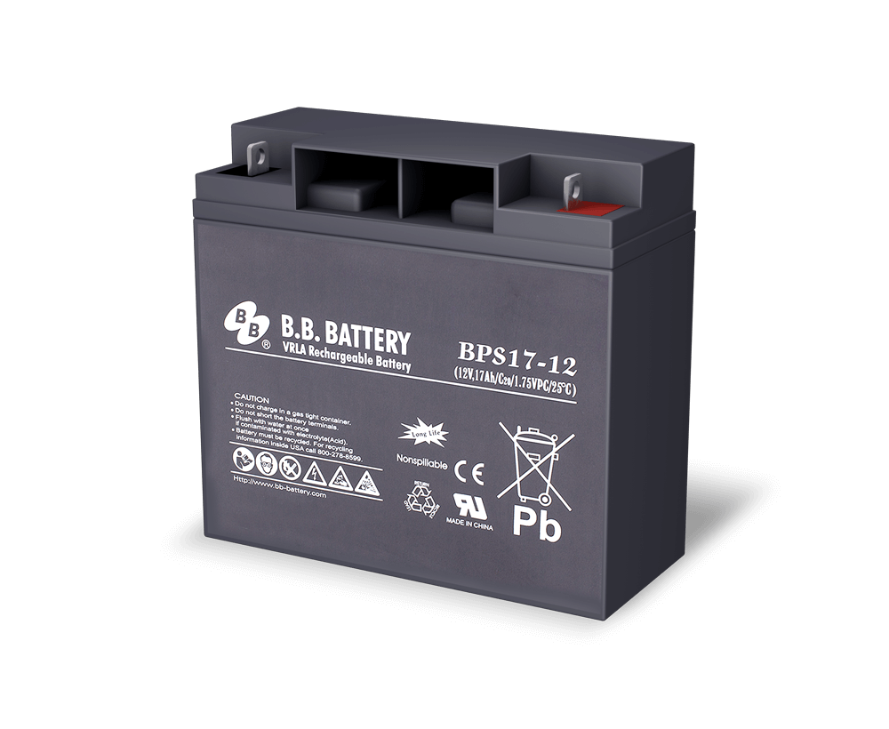 Батарея B.B. Battery серия BPS, BPS17-12, напряжение 12В, емкость 12Ач (разряд 20 часов), макс. ток разряда (5 сек.) 255А, макс. ток заряда 5.1A, свинцово-кислотная типа AGM, клеммы B1, ДxШxВ 181x76x166мм., вес 6.15кг., срок службы 12 лет/ B.B. Battery series BPS, BPS17-12, voltage 12V, capacity 12Ah (discharge 20 hours), max. discharge current (5 sec.) 255A, max. charge current 5.1A, lead-acid type AGM, terminals B1, LxWxH 181x76x166mm, weight 6.15kg, service life 12 years
