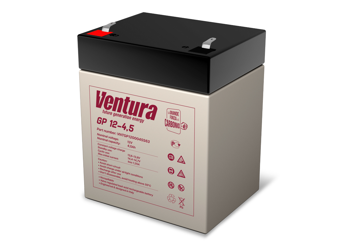 Батарея Ventura серия GP, GP12-4.5, напряжение 12B, емкость 4.5Ач (разряд 20 часов), макс. ток заряда 1.35А, свинцово-кислотная типа AGM, клеммы T2, ДШВ 90х70х107мм, вес 1.45кг/ Ventura battery series GP, GP12-4.5, voltage 12V, capacity 4.5Ah (discharge 20 hours), max. charge current 1.35A, lead-acid AGM type, T2 terminals, LShV 90x70x107mm, weight 1.45kg