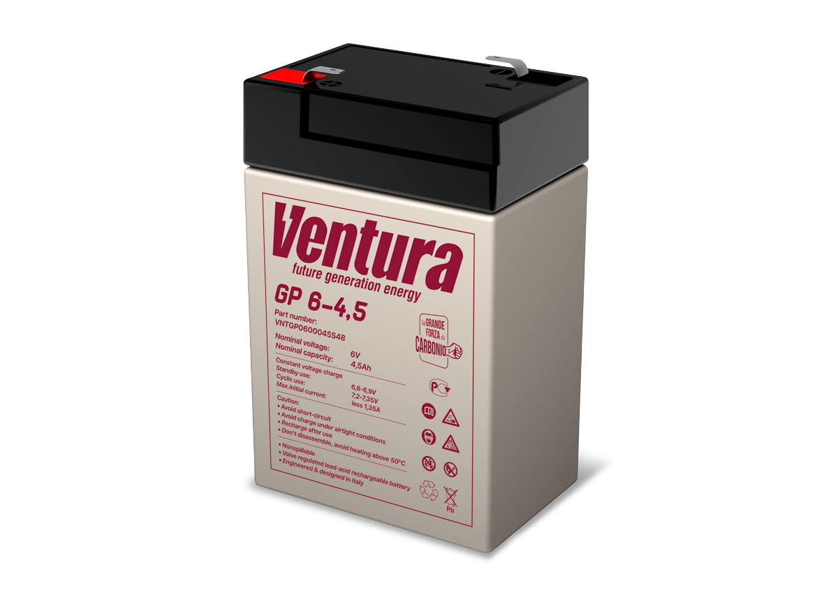 Батарея Ventura серия GP, GP6-4.5, напряжение 6B, емкость 4.5Ач (разряд 20 часов), макс. ток заряда 1.3А, свинцово-кислотная типа AGM, клеммы T1, ДШВ 70х47х107мм, вес 0.73кг/ Ventura battery series GP, GP6-4.5, voltage 6V, capacity 4.5Ah (discharge 20 hours), max. charge current 1.3A, lead-acid AGM type, T1 terminals, LShV 70x47x107mm, weight 0.73kg