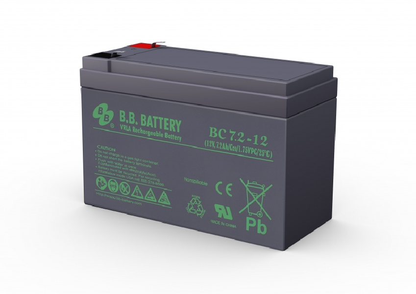 Батарея B.B. Battery серия BC, BC7.2-12, напряжение 12В, емкость 7.2Ач (разряд 20 часов), макс. ток разряда (5 сек.) 108А, макс. ток заряда 2.16A, свинцово-кислотная типа AGM, клеммы T2, ДxШxВ 151x65x100мм., вес 2.2кг., срок службы 5-7 лет/ B.B. Battery series BC, BC7.2-12, voltage 12V, capacity 7.2Ah (discharge 20 hours), max. discharge current (5 sec.) 108A, max. charge current 2.16A, lead-acid AGM type, T2 terminals, LxWxH 151x65x100mm, weight 2.2kg, service life 5-7 years