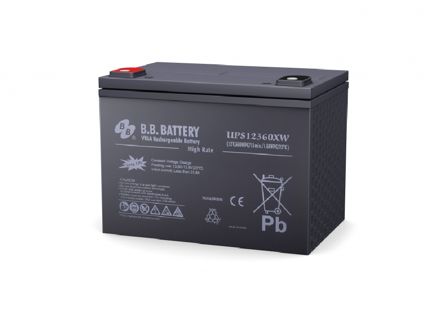 VRLA-аккумуляторы B.B. Battery серии UPS производятся в виде моноблоков напряжением 12 В и мощностью от 1320 до 3720 Вт на блок. Корпус аккумуляторов изготовлен из непрозрачного ударопрочного ABS-пластика. Крышка батареи надежно соединена с корпусом, а клеммные площадки герметизированы. Конструкция клемм зависит от типа батареи. Во время производства аккумулятор заполняется электролитом через шесть отверстий, находящихся в крышке аккумулятора. Затем в заливные отверстия устанавливаются предохранительные клапаны, изготовленные из негорючих материалов.