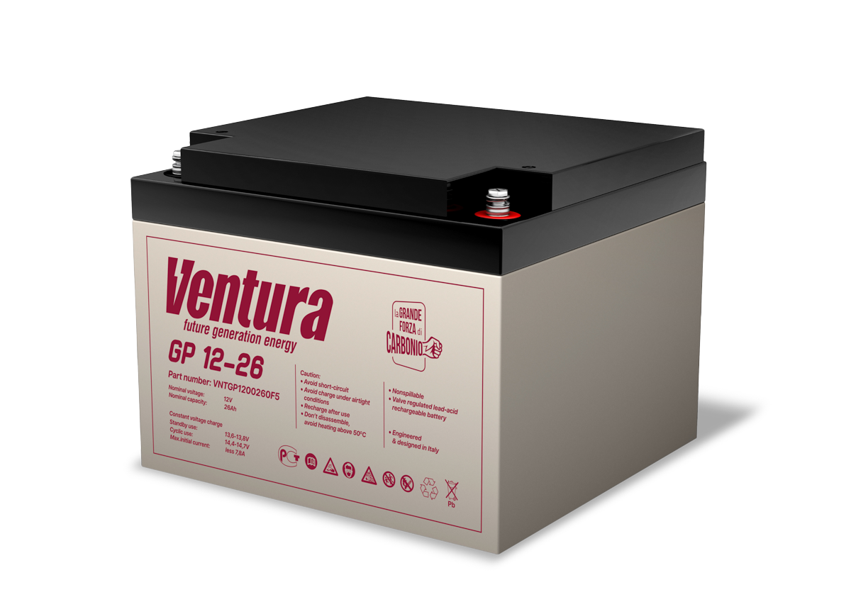 Батарея Ventura серия GP, GP12-26, напряжение 12B, емкость 26Ач (разряд 20 часов), макс. ток заряда 7.8А, свинцово-кислотная типа AGM, клеммы F5, ДШВ 178х166х125мм, вес 8.2кг/ Ventura battery GP series, GP12-26, voltage 12V, capacity 26Ah (discharge 20 hours), max. charging current 7.8A, lead-acid type AGM, terminals F5, LxWxH 178x166x125mm, weight 8.2kg