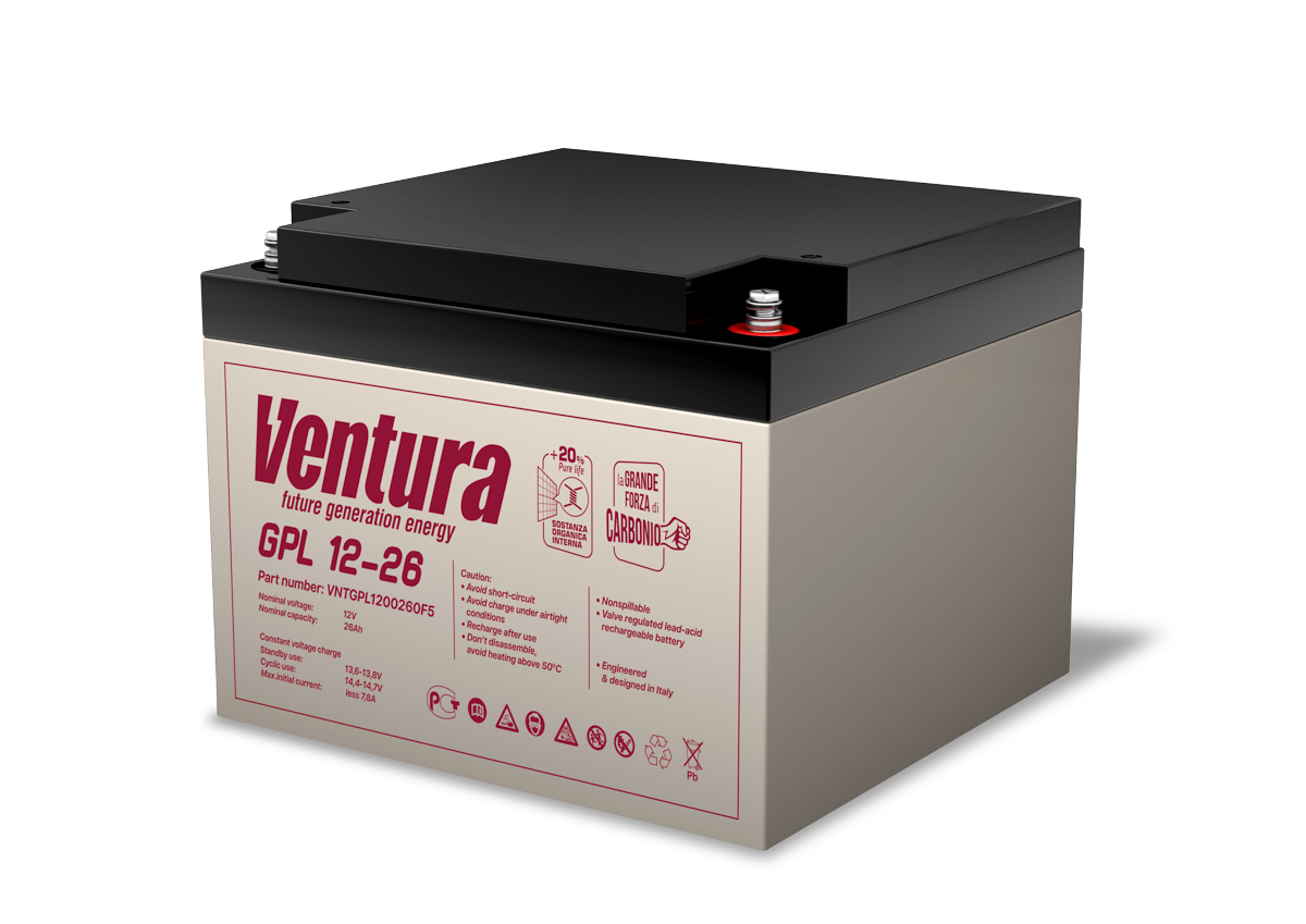 Батарея Ventura серия GPL, GPL12-26, напряжение 12B, емкость 26Ач (разряд 20 часов), макс. ток заряда 7.8А, свинцово-кислотная типа AGM, клеммы F5, ДШВ 166х175х125мм, вес 8.2кг/ Ventura battery GPL series, GPL12-26, voltage 12V, capacity 26Ah (discharge 20 hours), max. charging current 7.8A, lead-acid type AGM, terminals F5, LxWxH 166x175x125mm, weight 8.2kg