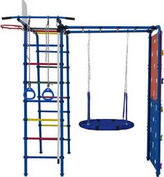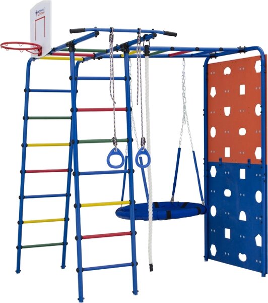 - Элементы в комплекте лестница, турник, качели, канат, кольца, рукоход, стена для лазания, баскетбольная корзина