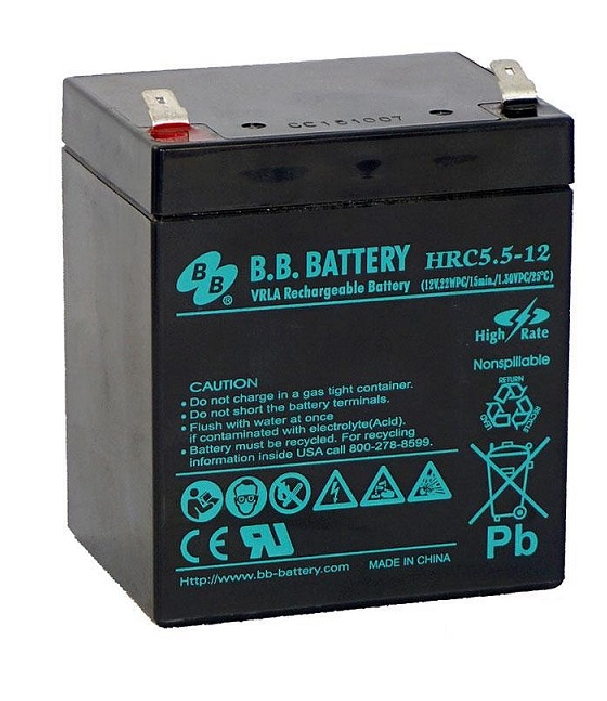 Батарея B.B. Battery серия HRC, HRC5.5-12, напряжение 12В, емкость 5.5Ач (разряд 20 часов), макс. ток разряда (5 сек.) 75А, макс. ток заряда 1.5A, свинцово-кислотная типа AGM, клеммы Т2, ДxШxВ 90x70x106мм., вес 1.62кг., срок службы 5 лет/ B.B. Battery series HRC, HRC5.5-12, voltage 12V, capacity 5.5Ah (discharge 20 hours), max. discharge current (5 sec.) 75A, max. charge current 1.5A, lead-acid AGM type, T2 terminals, LxWxH 90x70x106mm, weight 1.62kg, service life 5 years