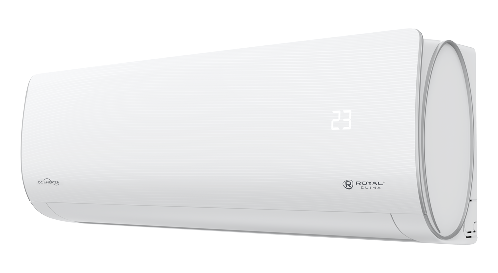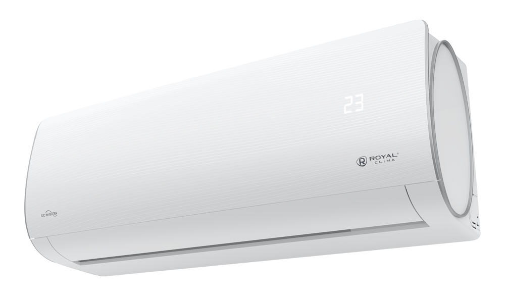 Royal Clima Aria Inverter RCI-AR35HN — инверторный кондиционер, предназначенный для охлаждения и обогрева помещений до 35 м². Дизайнерский внутренний блок выполнен в классическом белом цвете, с перфорацией лицевой панели и серебристыми вставками по бокам.