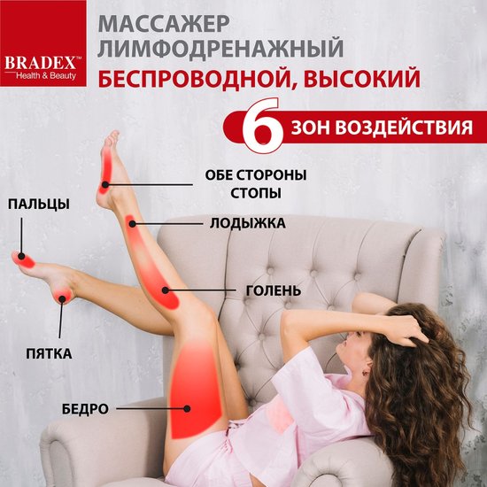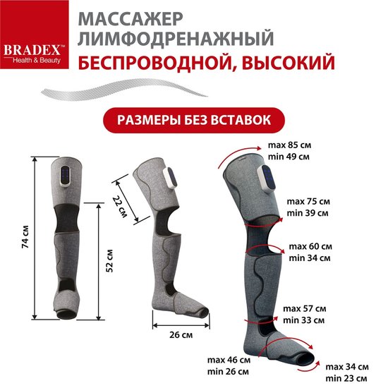 ✅ Компрессионный лимфодренажный массажер для ступней, икр и бедер — это специальное беспроводное устройство, предназначенное для проведения массажа и улучшения кровоснабжения нижних конечностей.✅ На выбор предлагается 3 уровня интенсивности и 4 режима вибрации. Можно выбрать мягкий массаж для ежедневного использования, средний массаж для снятия напряжения и боли и интенсивный массаж для глубокого расслабления. Встроенная функция прогрева позволяет индивидуально подобрать один из трех уровней температуры - низкий, средний или высокий.✅ Массажер выполнен в виде одного сапога, он также снабжен дополнительными вставками для увеличения объема манжет в зонах икр и бедер. Сапог оснащен индивидуальным блоком управления с сенсорным экраном. Интуитивно понятное управление обеспечивает удобство и легкость использования.✅ Сапог сделан из высококачественных гипоаллергенных материалов и легко надевается на ноги. Он обеспечивает комфортное плотное прилегание к телу, благодаря регулируемым липучкам. Массажер можно легко подстроить под различные объемы ног.✅ Основной принцип работы массажера – создание компрессии с помощью аэрокомпрессионных подушек, которые наполняются воздухом и сдуваются, воздействуя тем самым на мышцы ног. Это обеспечивает массаж глубоких тканей и улучшает кровообращение, помогает расщеплению подкожного жира, а также воздействует на упругость и эластичность кожи, помогая поддерживать ее в отличном состоянии. Равномерно расположенные аэрокомпрессионные подушки распределяют давление по всей поверхности ног, повышая эффективность массажного воздействия и обеспечивая быстрый положительный результат.✅ В памяти массажера записано 6 автоматических режимов аэрокомпрессии, которые запрограммированы в зависимости от воздействия на определенные зоны ног.✅ Кроме того, массажер имеет эффект лимфодренажа, он помогает выводить из организма токсины, которые накапливаются в тканях нижних конечностей. Это важно для людей, страдающих от отечности, варикоза, аллергических реакций, целлюлита и других проблем, связанных с нарушением кровообращения и лимфотока.✅ Беспроводной лимфодренажный массажер для ног – удобное компактное устройство, которое можно использовать дома, на работе или в спортивном зале. Он позволяет провести эффективный массаж нижних конечностей в любое время, без необходимости обращения к специалистам. Лимфодренажный массаж поможет снять мышечное напряжение, восстановить нормальное кровоснабжение и лимфоток.✅ Использование массажера значительно улучшает состояние тканей, ускоряет их восстановление после травм или перенапряжения, улучшает мышечный тонус и общее состояние ног. Это позволяет сохранять молодость и здоровье нижних конечностей на протяжении многих лет.✅ Выбор беспроводного лимфодренажного массажера – это лучшее решение для тех, кто ценит качественный массаж и уход за своим телом.⚠️ Массажер рекомендован:• людям, страдающим от хронической боли в мышцах и суставах✅ Компрессионный лимфодренажный массажер для ступней, икр и бедер — это специальное беспроводное устройство, предназначенное для проведения массажа и улучшения кровоснабжения нижних конечностей.✅ На выбор предлагается 3 уровня интенсивности и 4 режима вибрации. Можно выбрать мягкий массаж для еже