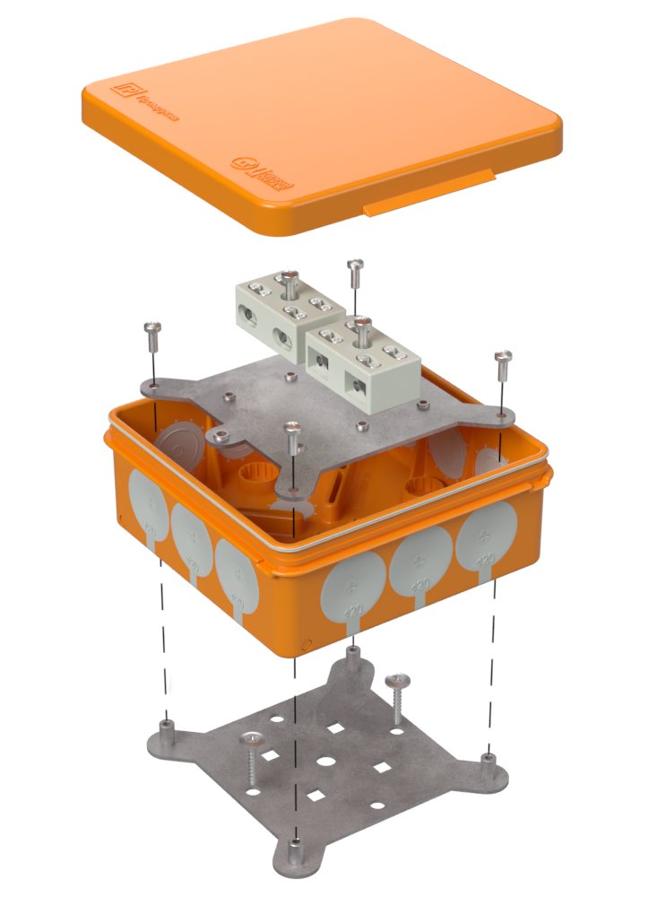 ЭМК двухкомпонентные огнестойкие сочетают в себе надежность и высокую скорость монтажа. Они применяются при прокладке систем противопожарной безопасности по различным поверхностям зданий и сооружений, необходимы для механической защиты мест соединения проводов и кабелей, а так же для защиты от проникновения пыли, влаги и посторонних предметов. Лаконичный дизайн способствует эстетичному монтажу проводки, а мембраны позволяют увеличить скорость монтажа (по сравнению со скоростью при использовании ЭМК с гермовводами). Материал изготовления коробок является безгалогенным, что позволяет использовать изделие в общественных местах с высоким скоплением людей. Коробка имеет монолитное исполнение с уплотнителем и мембранами за счёт чего достигается высокая степень защиты IP66.