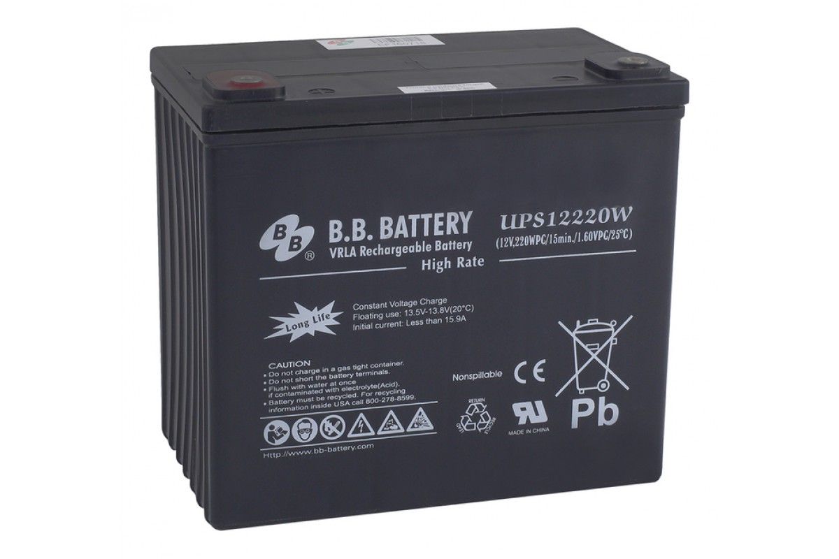 Батарея B.B. Battery серия UPS (MPL), UPS12220W (MPL55-12), напряжение 12В, емкость 53Ач (разряд 10 часов), макс. ток разряда (5 сек.) 1600А, макс. ток заряда 15.9A, свинцово-кислотная типа AGM, клеммы I2, ДxШxВ 228х139х207мм, 17.8 кг/ B.B. Battery series UPS (MPL), UPS12220W (MPL55-12), voltage 12V, capacity 53Ah (discharge 10 hours), max. discharge current (5 sec.) 1600A, max. charge current 15.9A, lead-acid AGM type, I2 terminals, LxWxH 228x139x207mm, 17.8 kg