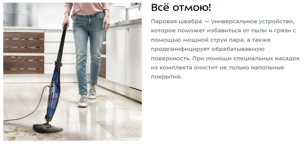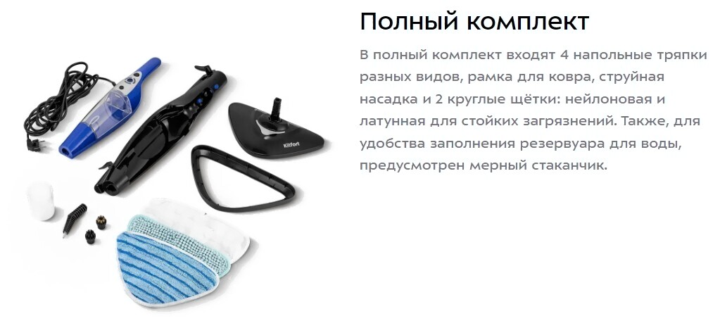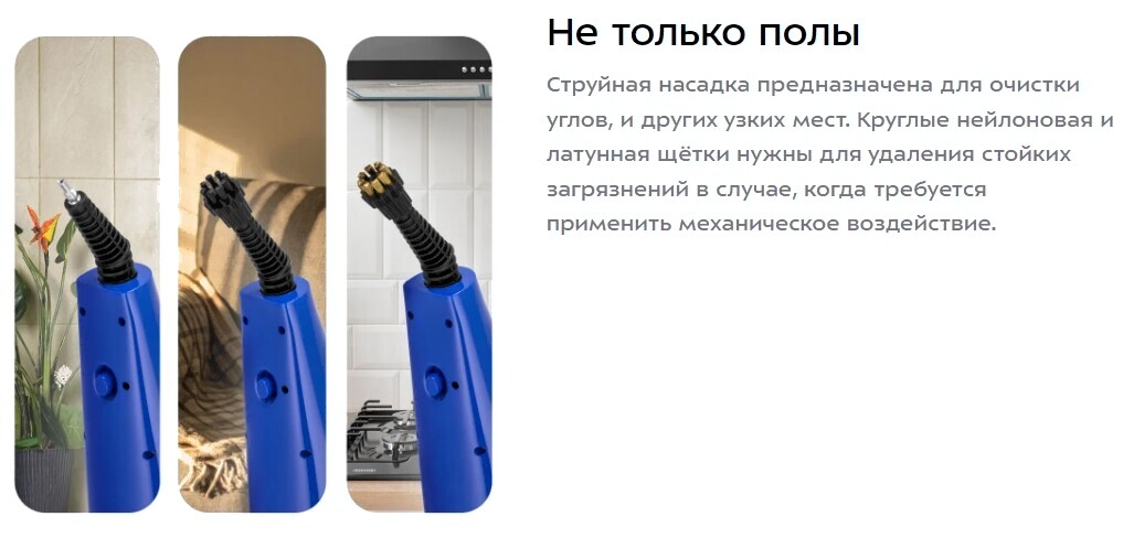 • Комплектация тряпка для пола, рамка для ковра, струйная насадка, круглая щетка (нейлоновая и латунная), мерный стакан