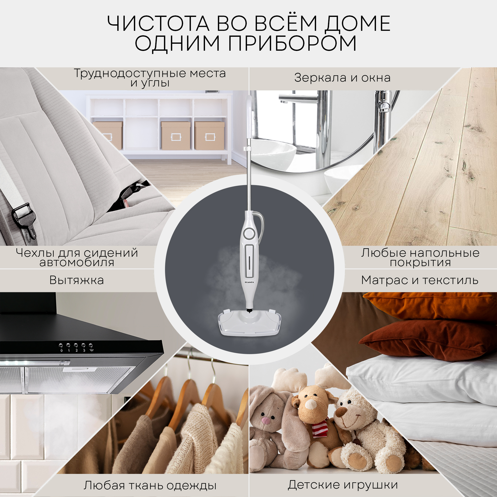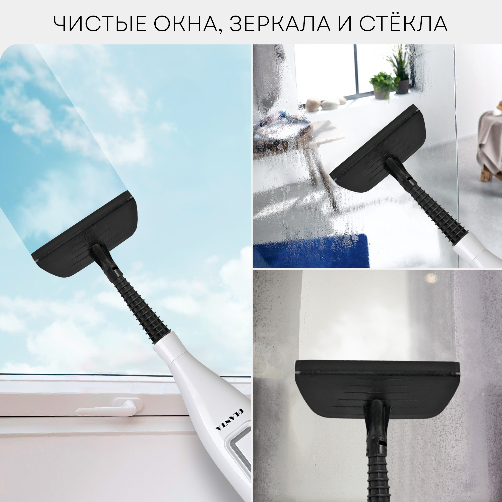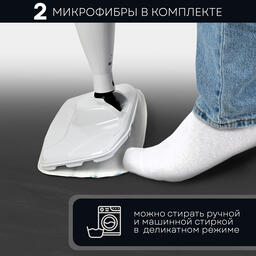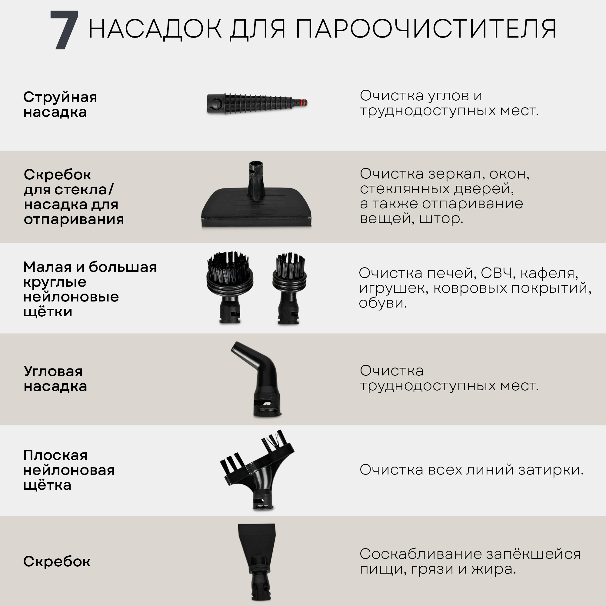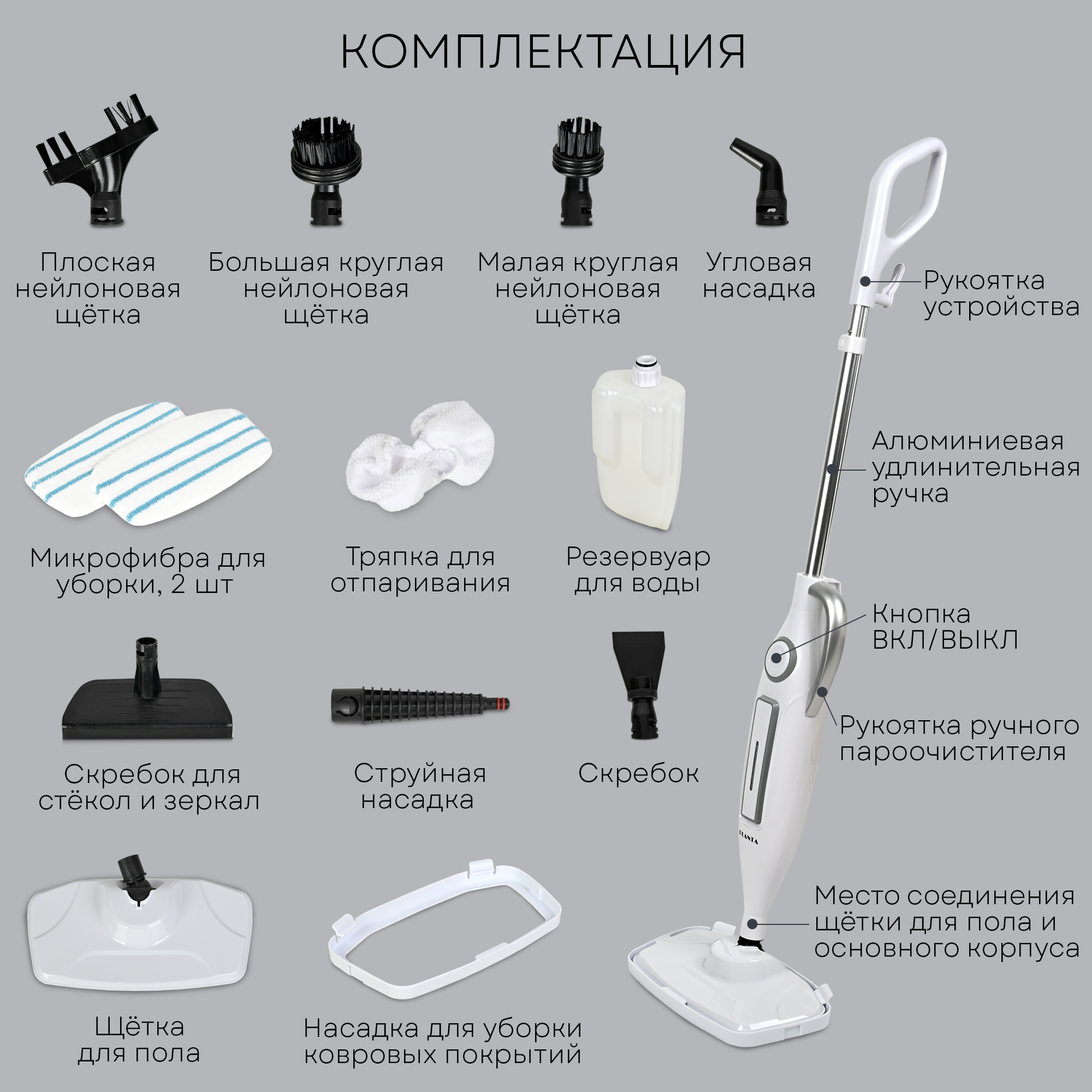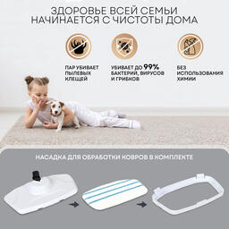 • Комплектация насадка для мойки окон, насадка для мытья полов, угловая насадка, плоская щетка, круглая щетка (малая, большая), тряпка для пола, насадка для отпаривания, тряпка для отпаривания, струйная насадка, скребок, рамка для ковра