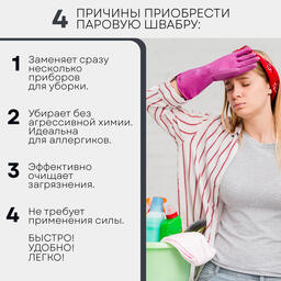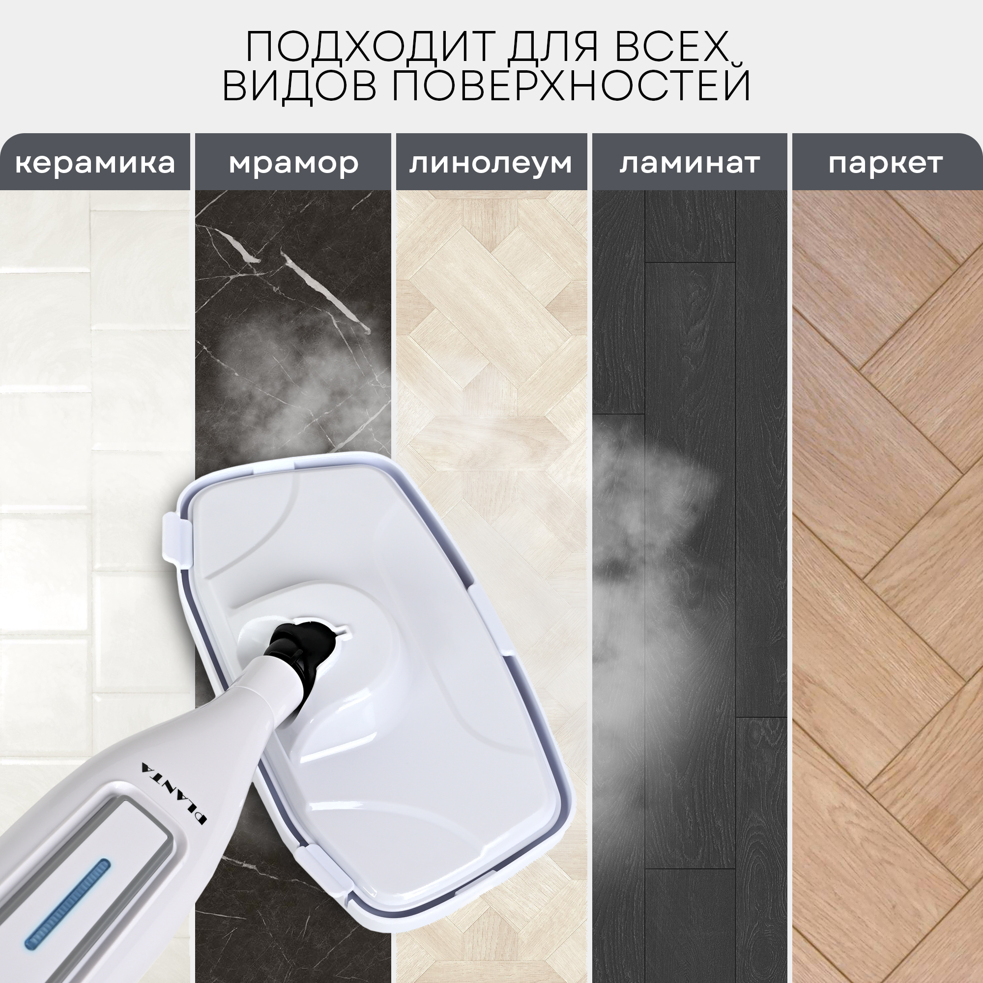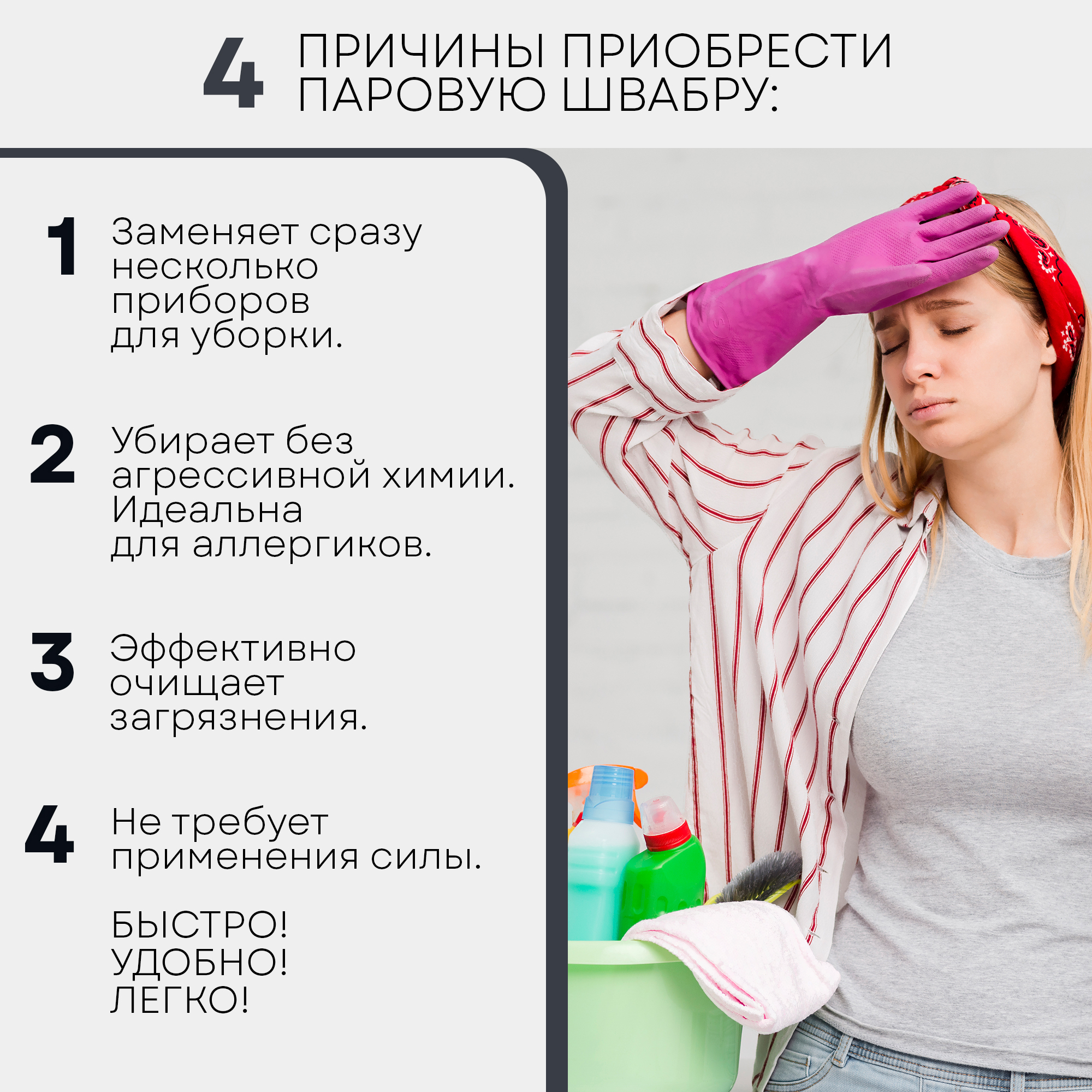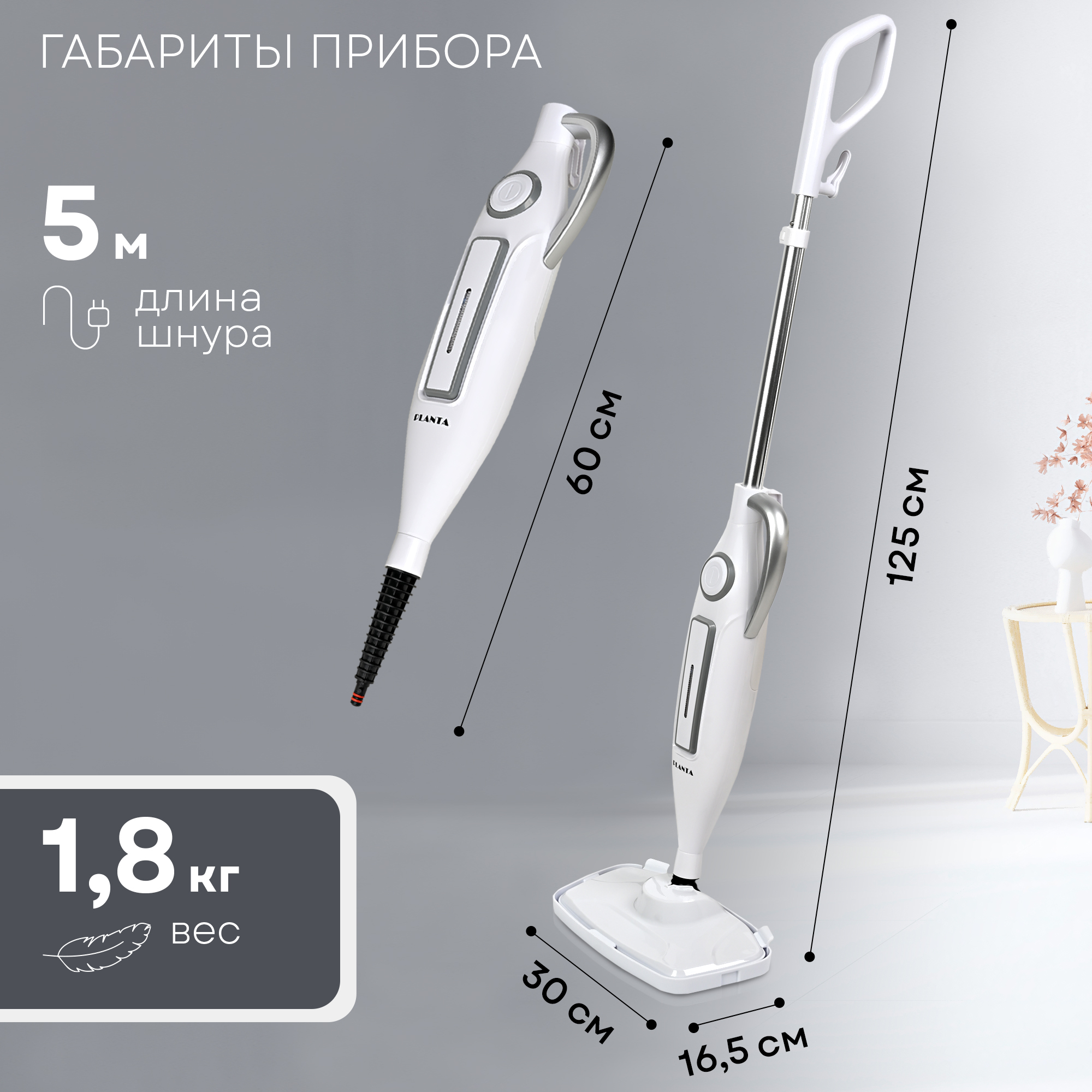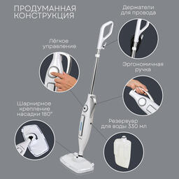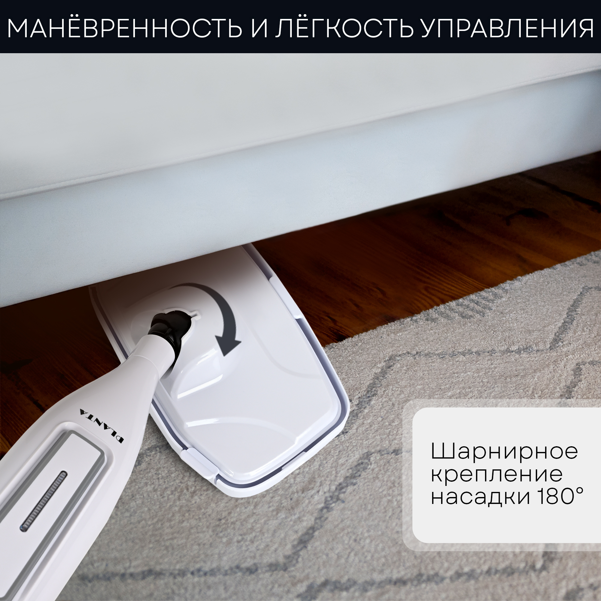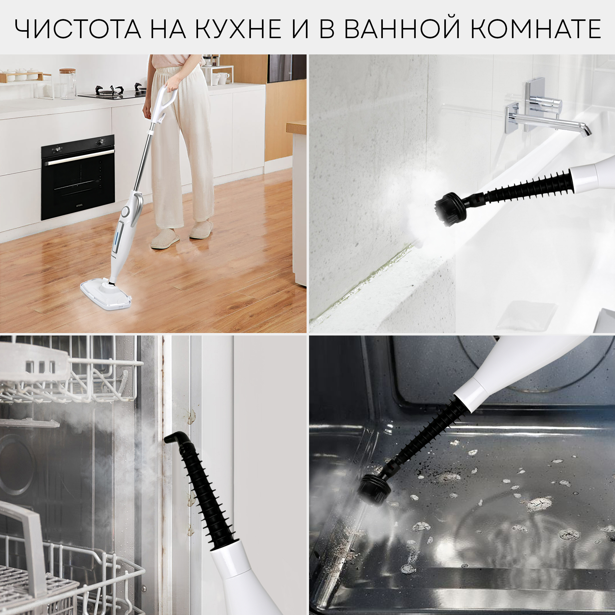• Комплектация насадка для мойки окон, насадка для мытья полов, угловая насадка, плоская щетка, круглая щетка (малая, большая), тряпка для пола, насадка для отпаривания, тряпка для отпаривания, струйная насадка, скребок, рамка для ковра