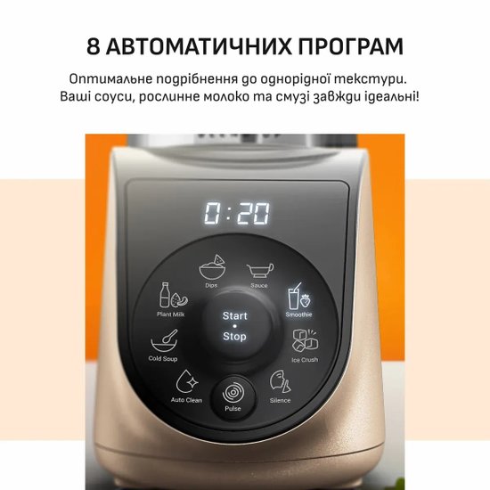 • Список автоматических программ Соус, Смузи, Измельчение льда, Холодный суп, Растительное молоко, Дип-соусы, Тихая работа, Автоматическая очистка