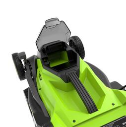 Аккумуляторная газонокосилка Greenworks 40В GD40LM361 - модель 2025 года с обновленным характеристиками и дизайном: увеличенная мощность, комбинированный травосборник с жесткой верхней частью с индикатором заполнения и мягкой складной нижней частью для удобства хранения, новая эргономичная конструкция выключателя, новые стильные колеса. Предназначена для небольших газонов.