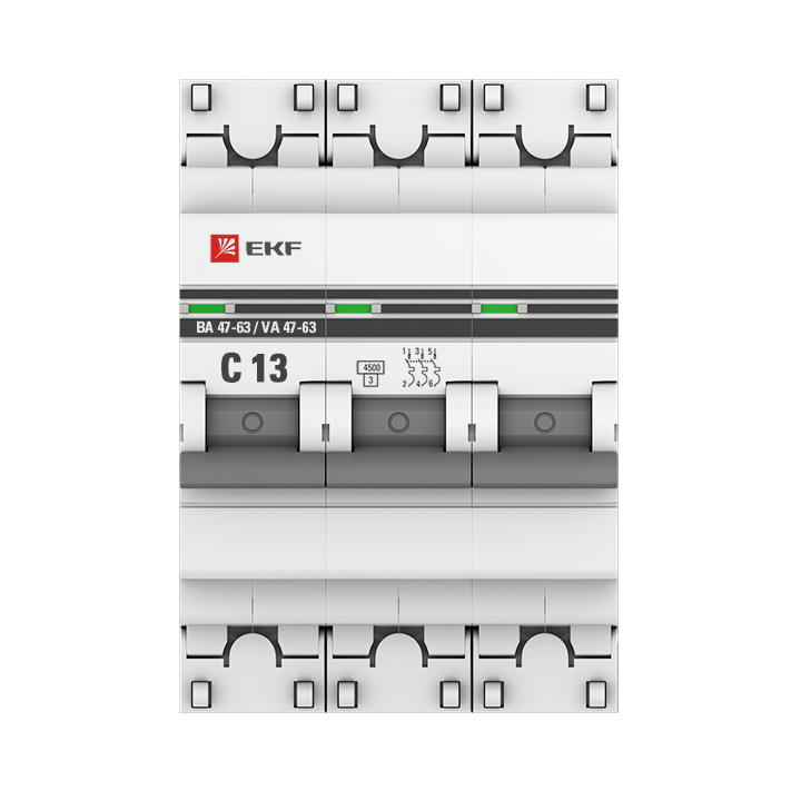 Автоматические выключатели ВА 47-63 4,5 кА EKF PROxima являются механическими коммутационными аппаратами, производятся в одно-, двух-, трех- и четырехполюсном исполнениях и соответствуют ГОСТ Р50345-2010. Особенностью данной серии выключателей является усовершенствованная конструкция. В выключателях имеются пластиковые крышки, закрывающие доступ к винтовому зажиму и служащие для опломбирования выключателей, что исключает несанкционированный доступ к проводникам. Корпус выключателей усилен дополнительными заклепками для устранения эффекта расхождения корпуса. Выключатели оборудованы удобной ручкой управления, обеспечивающей надежное оперирование изделиями. На лицевой панели выключателей имеется цветовой индикатор состояния. Конструкция установочного зажима обеспечивает свободную установку выключателя на DIN-рейку.
