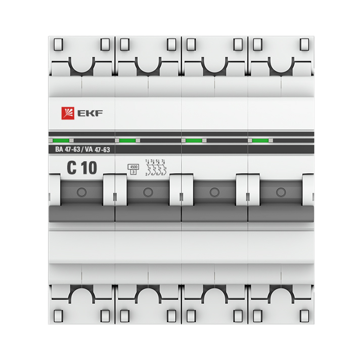 Автоматические выключатели ВА 47-63 4,5 кА EKF PROxima являются механическими коммутационными аппаратами, производятся в одно-, двух-, трех- и четырехполюсном исполнениях и соответствуют ГОСТ Р50345-2010. Особенностью данной серии выключателей является усовершенствованная конструкция. В выключателях имеются пластиковые крышки, закрывающие доступ к винтовому зажиму и служащие для опломбирования выключателей, что исключает несанкционированный доступ к проводникам. Корпус выключателей усилен дополнительными заклепками для устранения эффекта расхождения корпуса. Выключатели оборудованы удобной ручкой управления, обеспечивающей надежное оперирование изделиями. На лицевой панели выключателей имеется цветовой индикатор состояния. Конструкция установочного зажима обеспечивает свободную установку выключателя на DIN-рейку.