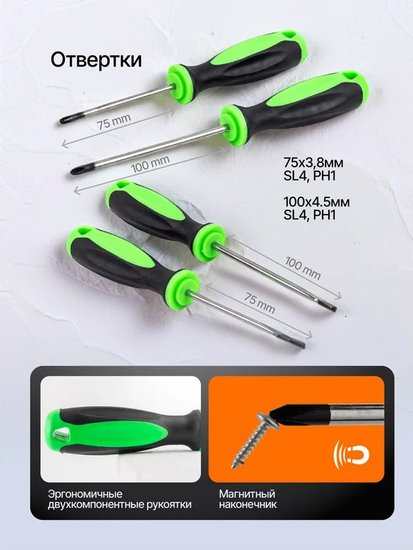 ✅ Широкий спектр применения: Набор инструментов идеально подходит для различных ремонтно-бытовых работ, сборки мебели и создания поделок. Вы сможете использовать его для проектов любой сложности, от мелкого ремонта до более серьезных задач.✅ Высокое качество: Все инструменты изготовлены из прочной стали, что гарантирует их долговечность и надежность. Вы можете быть уверены, что они выдержат интенсивное использование и прослужат вам долго.✅ Эргономичность: Отвертки оснащены удобными ручками, что обеспечивает комфортную работу даже при длительном использовании. Это помогает снизить усталость рук и сосредоточиться на выполнении задач.✅ Компактность: Набор легко хранить и транспортировать благодаря своему компактному размеру. Он удобно помещается в сумке, что позволяет брать его с собой в поездки или использовать в повседневной жизни, не занимая много места.✅ Практичность: Этот набор станет вашим незаменимым помощником для быстрого выполнения задач, таких как замена деталей, установка полок и ремонт мебели. Он идеально подходит как для домашнего использования, так и для дачи. ⚠️ Не упустите возможность сделать свои проекты проще и быстрее!✅ Широкий спектр применения: Набор инструментов идеально подходит для различных ремонтно-бытовых работ, сборки мебели и создания поделок. Вы сможете использовать его для проектов любой сложности, от мелкого ремонта до более серьезных задач.✅ Высокое качество: Все инструменты изготовлены из прочной стали, что гарантирует их долговечность и надежность. Вы можете быть уверены, что они выдержат интенсивное использование и прослужат вам долго.✅ Эргономичность: Отвертки оснащены удобными ручками, что обеспечивает комфортную работу даже при длительном использовании. Это помогает снизить усталость рук и сосредоточиться на выполнении задач.✅ Компактность: Набор легко хранить и транспортировать благодаря своему компактному размеру. Он удобно помещается в сумке, что позволяет брать его с собой в поездки или использовать в повседневной жизни, не занимая много места.✅ Практичность: Этот набор станет вашим незаменимым помощником для быстрого выполнения задач, таких как замена деталей, установка полок и ремонт мебели. Он идеально подходит как для домашнего использования, так и для дачи. ⚠️ Не упустите возможность сделать свои проекты проще и быстрее!